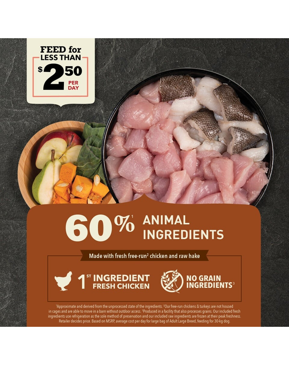 Koostis: Värske kanaliha (13%), kanaliha jahu (12%), kalkuni jahu (11%), punased läätsed, terved herned (8%), värsked kana siseelundid (maks, süda, neerud) (4%), heeringa jahu (4%) , hernekiud, värsked terved munad (4%), värske terve lest (4%), heeringa õli (3%), päikese käes kuivatatud lutsern, põlduba, rohelised läätsed, terved kollased herned, kanarasv (3%), kanakõhr (2%), kuivatatud pruunvetikas, värske terve kõrvits, värske terve muskaatkõrvits, värske pastinaak, värske lehtkapsas, värske spinat, värsked sinepi varsed, värske naeris, värsked terved porgandid, värsked punased õunad, värsked Bartletti pirnid, külmkuivatatud kanamaks, külmkuivatatud kalkuni maks, värsked jõhvikad, värsked mustikad, siguri juur, kurkum, piimohakas, takjajuur, lavendel, kibuvits, Enterococcus faecium.