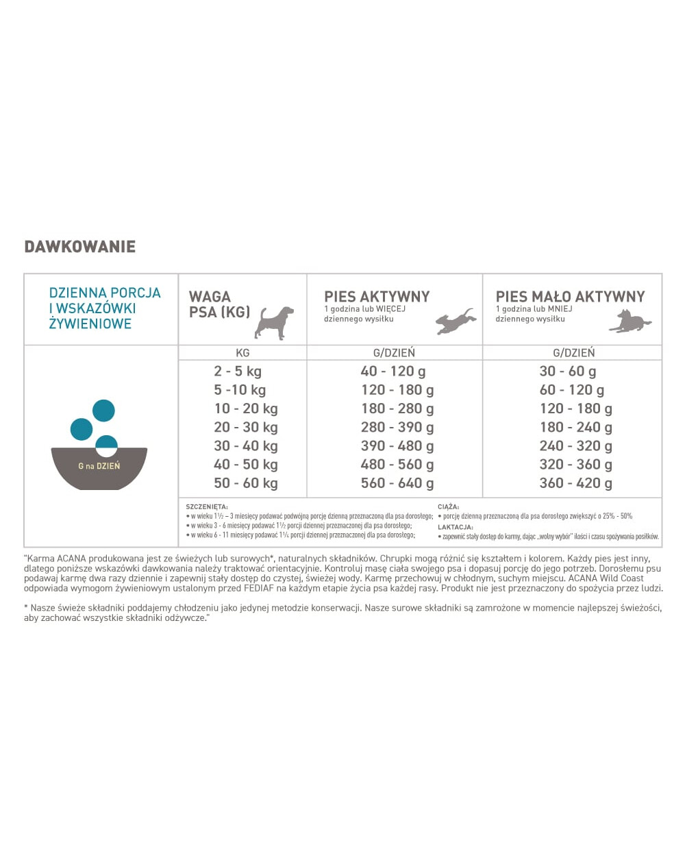 Retseptis kasutatud kvaliteetsed koostisosad tagavad toidu hea seeditavuse ja toitainete hea imendumise. Kalatoitu iseloomustab vähene allergeensus ja kõrge Omega 3 küllastumata rasvhapete sisaldus. Omega happed on olulised vereringe- ja närvisüsteemi nõuetekohaseks toimimiseks ning toetavad koera tugevat nägemist, nahka ja karvkatte. Acana Wild coast pakub kvaliteetset loomset päritolu valku, mis imendub koertele kõige paremini. Puuviljade, köögiviljade ja maitsetaimede lisamine toidule parandab selle maitseomadusi ja maitset. Õunad, pirnid ja kõrvits annavad looduslikke vitamiine ja antioksüdante, mis toetavad immuunsüsteemi.