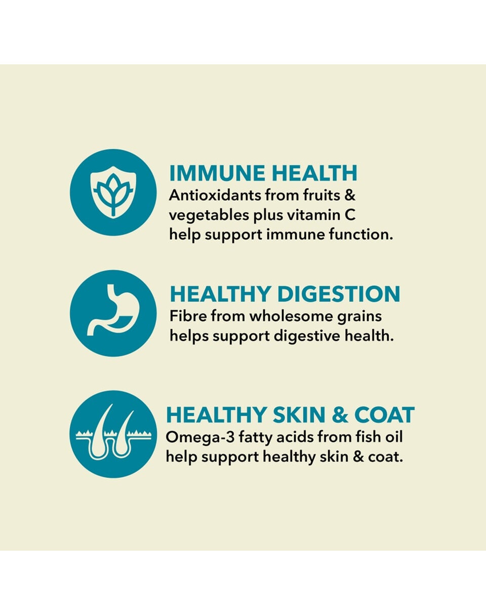 Toores lõhe (22%), dehüdreeritud heeringas (19%), pärlioder, terved herned, kooreta kaer, searasv (8%), terve kaer, kikerherne kiudained, kalaõli (1%), kaltsiumkarbonaat, kaaliumkloriid, kuivatatud merevetikad, sool, kuivatatud sigurijuur, värske terve kõrvits, värske terve muskusekõrvits, värske terve porgand, värske terve õun, värske terve pirn, värske terve suvikõrvits, värske lehtkapsas, värske spinat, värsked naeriselehed, värsked peedilehed, terved jõhvikad, terved mustikad, terved saskatoonid, kurkum, ohakas, kobarajuur, lavendel, valerianijuur, kibuvitsad.