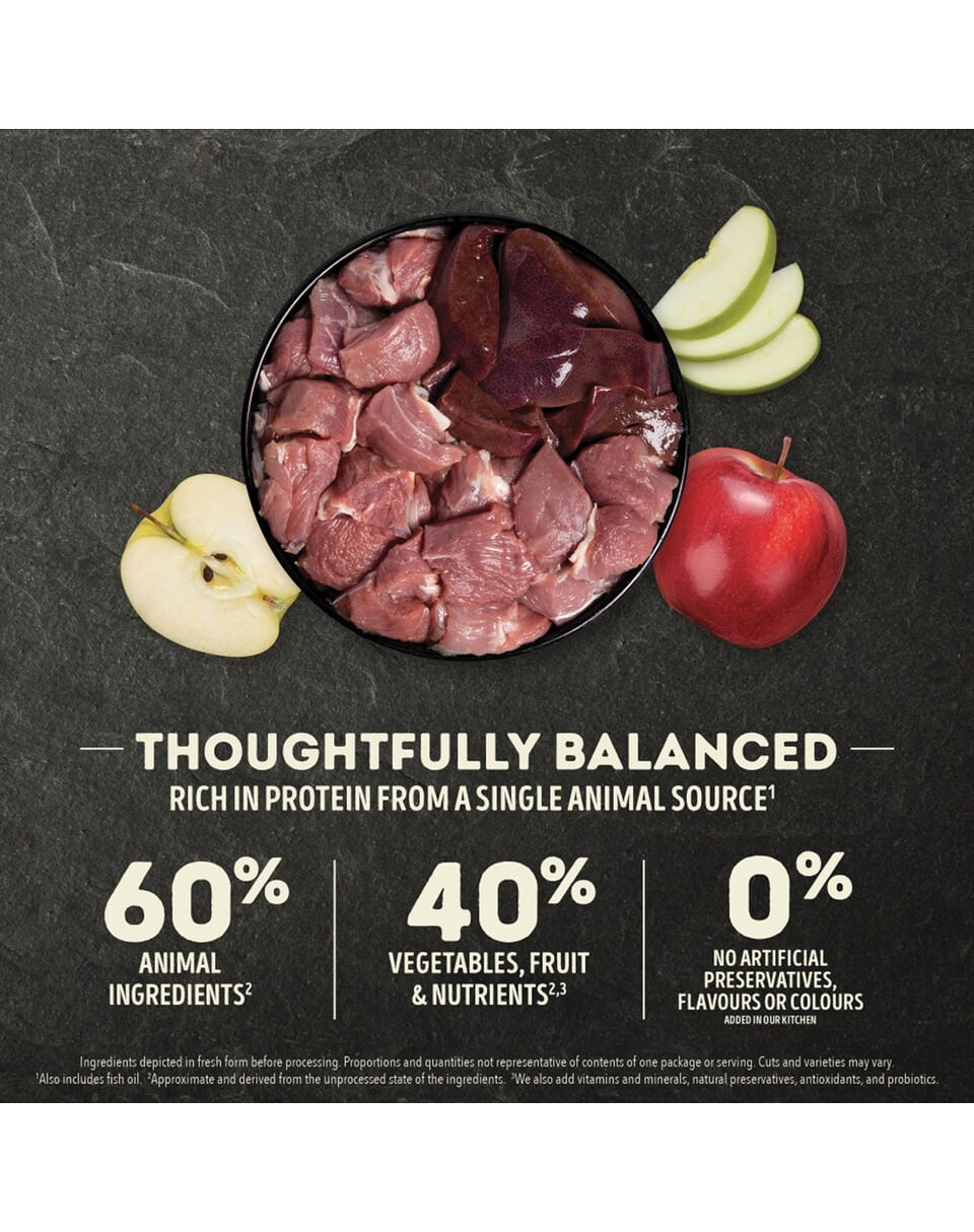 Toores lambaliha (18%), dehüdreeritud lambaliha (18%), terved rohelised herned, terved punased läätsed, toores lambamaks (4%), lambarasv (4%), värsked punased maitsvad õunad (4%), terved kikerherned, terved rohelised läätsed, terved kollased herned, toored lambaliha maod (2%), toored lambaliha neerud (2%), dehüdreeritud lamba kõhred (2%), läätsekiud, merevetikad (1,2%) (DHA ja EPA allikas), värske terve kõrvitsa kõrvits, värske terve kõrvits, kuivatatud pruun pruunvetikas, sool, külmkuivatatud lambamaks (0,1%), värsked terved jõhvikad, värsked terved mustikad, sigurijuur, kurkum, piimaohakas, takjajuur, lavendliõis, vahukommi juur, kibuvitsamarjad .