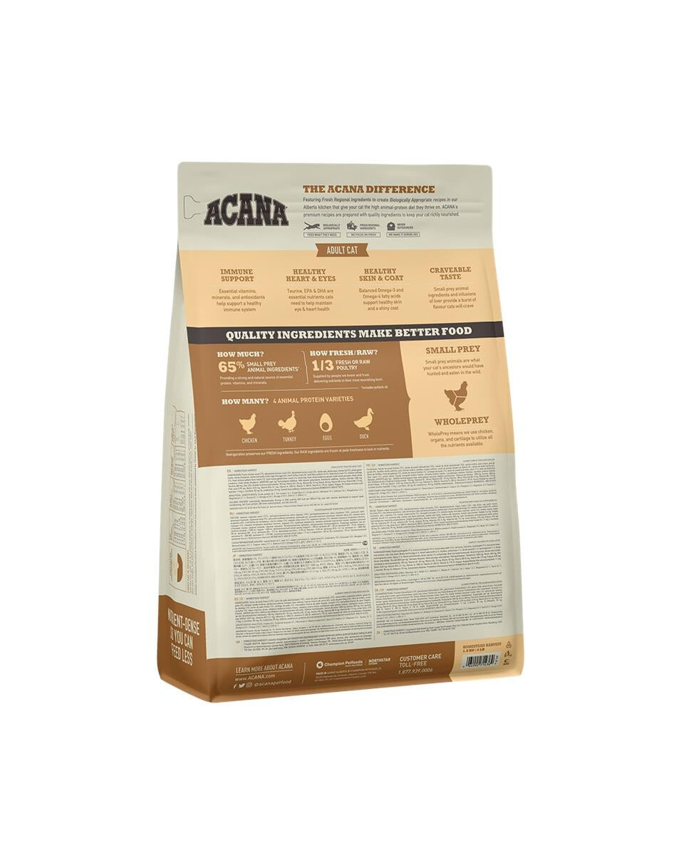 Acana Homestead Harvest sisaldab rikkalikult kana-, kalkuni- ja pardiliha WholePrey proportsioonides. Lisaks linnulihale sisaldab see ka elundeid ja kõhre, mis toidavad teie kassi looduslikult.