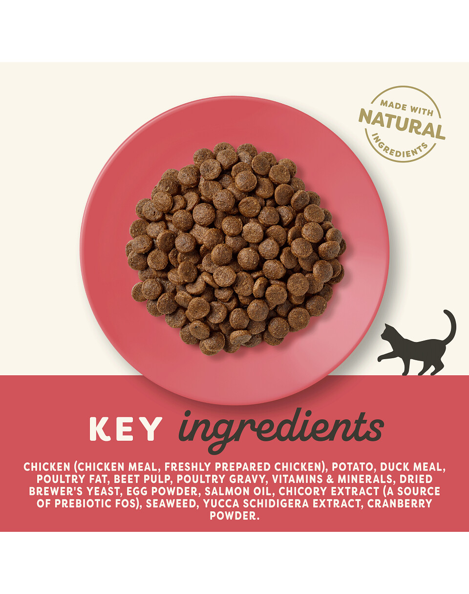 Kanajahu (47%), pardijahu (21%), värskelt jahvatatud linnuliha (16%), kartul, peedipulp, õllepärm, linnukaste (1%), lõheõli, vitamiinid ja mineraalained, kuivatatud muna, taimne tselluloosikiud (0,03%), naatriumkloriid, kaltsiumkarbonaat, merevetikad, jõhvikad, dl-metioniin, kaaliumkloriid, yucca ekstrakt, tsitrusviljade ekstrakt, rosmariini ekstrakt.