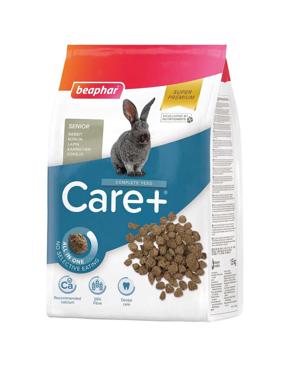 Care+ Senior Rabbit on erakordselt maitsev Super Premium toit. Selle retsept on välja töötatud koostöös veterinaararstide ja toitumisspetsialistidega. Care+ toodetakse ekstrusiooniprotsessi abil ja seetõttu on iga pellet identse koostisega (kõik-ühes). Selle tulemusena ei jää üle ja kasvatajad võivad olla kindlad, et kõik tervisele vajalikud koostisosad on ära söödud - see välistab täielikult maitsvamate toidu koostisosade valikulise söömise nähtuse. Pelletite kõvadus soodustab korralikku hammaste hõõrdumist. Tootmise ajal saavutatud temperatuur parandab valgu seeditavust. Graanuleid iseloomustab madal kaltsiumisisaldus, tasakaalustatud sisaldus tähtsaid polüküllastumata rasvhappeid Omega 6 ja Omega 3 (saadud nisust, sojast ja linaseemnetest), piisav kiudainesisaldus ja aromaatse timotiiniekstrakti lisamine. Olulist antioksüdantide funktsiooni täidavad C-vitamiin, E-vitamiin ja rohelise tee ekstrakt ning ženšenn, toetades seega küüliku loomulikku kaitsevõimet. Care+ Senior Rabbit on madala valgusisaldusega ja ei sisalda lisatud suhkrut, et vältida nende vähem aktiivsete küülikute rasvumist. Care+ Senior Rabbit on täiuslikult tasakaalustatud toit vanematele küülikutele, mis vastab kõigile nende loomulikele toitumisvajadustele.