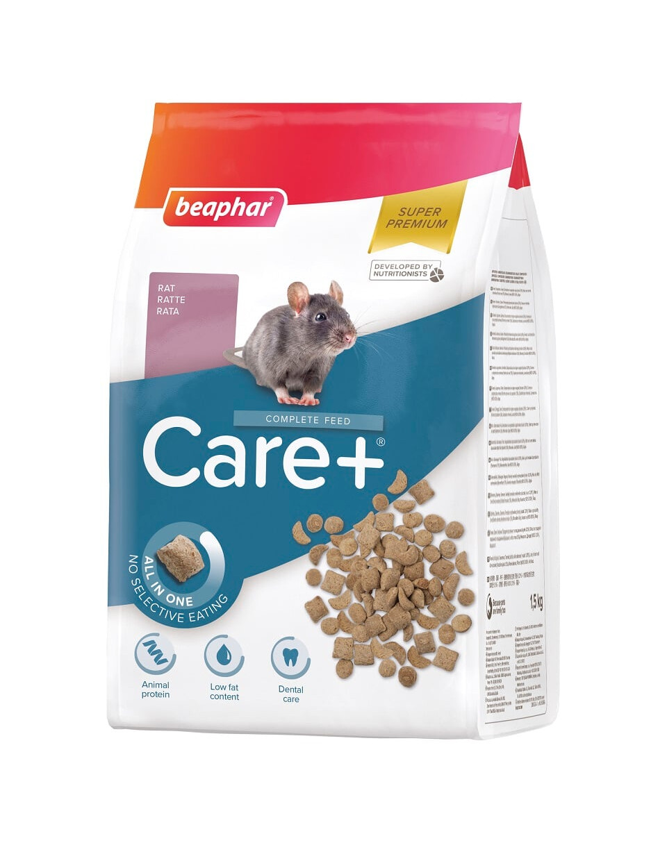 Care+ Rat on äärmiselt maitsev, täiuslikult tasakaalustatud kuivtoit rottidele. Retsept on välja töötatud koos veterinaararstide, toitumisspetsialistide ja rottide kasvatajatega. Spetsiaalne tootmisprotsess (ekstrusioon) tagab valgu kõrge seeditavuse, välistab toidust bakterid, hallitusseened ja viirused, mis teeb sellest tootest tervisliku, ohutu ja toitva toidu. Iga toidupellet on identse koostisega, mis välistab täielikult ainult teatud koostisosade valikulise söömise nähtuse. Loomad söövad peaaegu kogu toidu ja ei jäta ülejääke ning omanikud võivad olla kindlad, et kõik vajalikud ained on ette nähtud. Rotid vajavad valku nii loomsetest kui ka taimsetest allikatest. Söödas sisalduvates valkudes on suur hulk asendamatuid aminohappeid, mis on olulised nõuetekohaseks lihaskehade moodustamiseks. Care+ on madala rasvasisaldusega ja Omega 6 ja Omega 3 rasvhapete tasakaalustatud vahekorraga. Sööt sisaldab looduslikke koostisosi nagu Echinacea, Spirulina ja Yucca schidigera ning kelaaditud mineraalaineid. FOS ja MOS kombinatsioonil on soodne mõju soolefloorale.