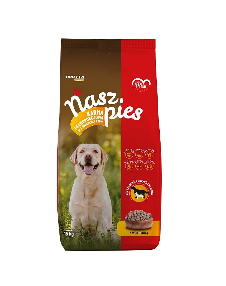 „NASZ PIES” on täisväärtuslik toit täiskasvanud koertele, mis pakub maitsvaid graanuleid veiselihaga. Õigesti tasakaalustatud koostis, rikastatud lisanditega nagu peedikoore pulber ja lõheõli, toetab seedesüsteemi tööd ning karva ja naha välimust. Kõva, krõmpsuv struktuur aitab säilitada suuhügieeni ja vähendab hambakivi.