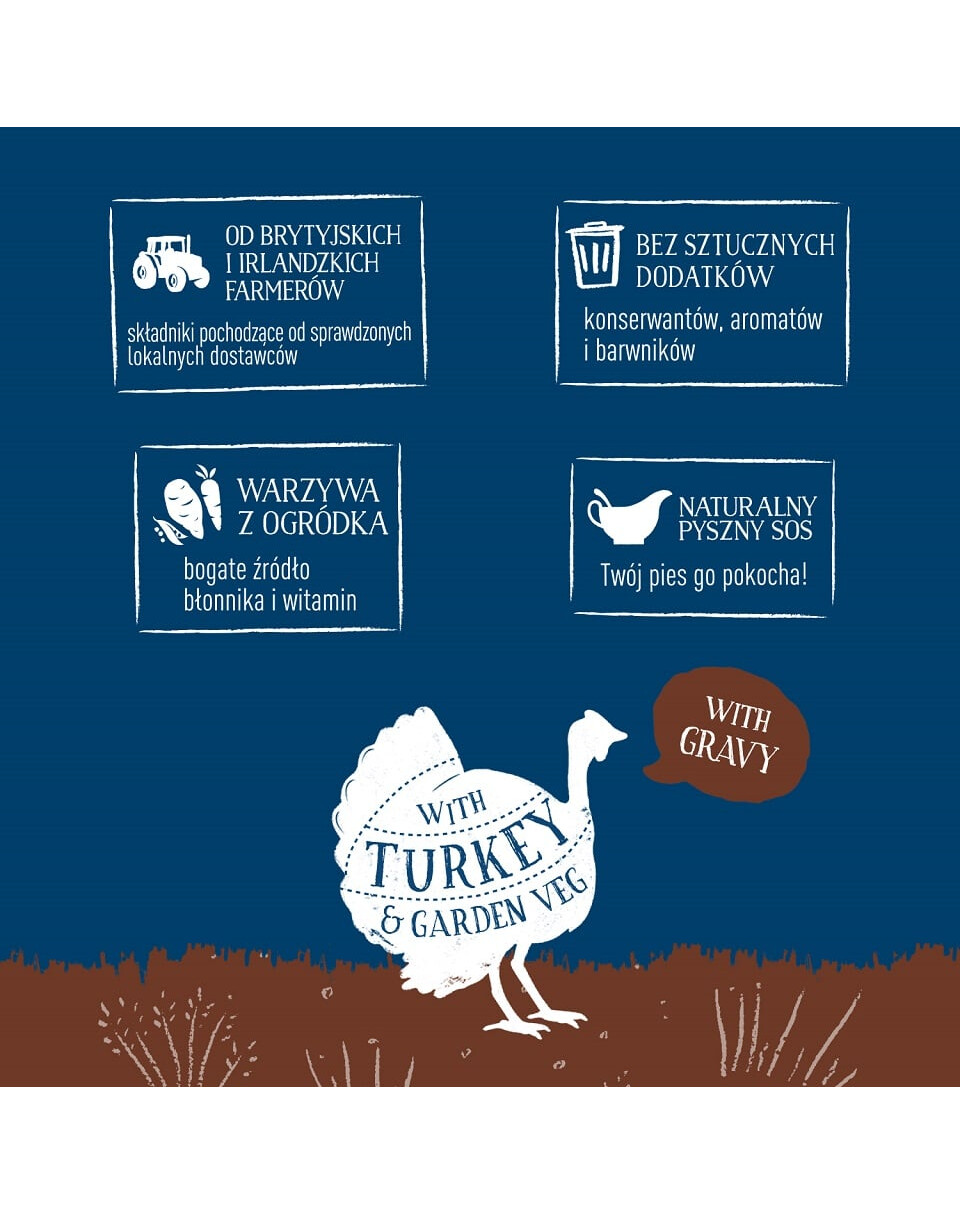 Täisväärtuslik koeratoit, esitatud mahlakate tükkidena kalkuniga, maitsvas kastmes koos aedviljadega otse aiast. Täiuslikult tasakaalustatud, teraviljavaba retsept, mis põhineb looduslikest koostisosadest, maitseb kindlasti neljajalgsele sõbrale ja annab talle kõik vajalikud toitaineväärtused.