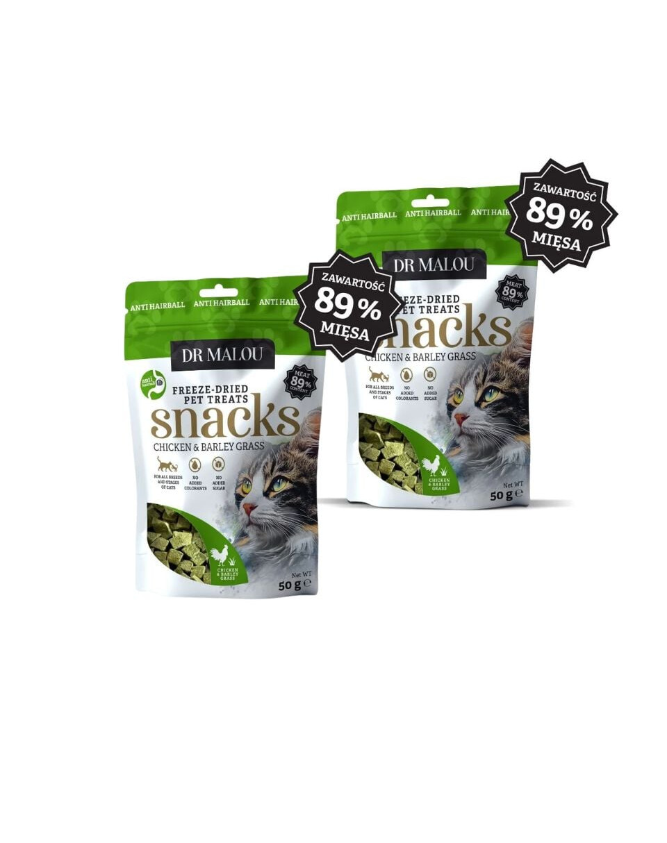 Kasside täiendav toit – 100% liofiliseeritud kana ja rohelise odra kuubikud Dr Malou