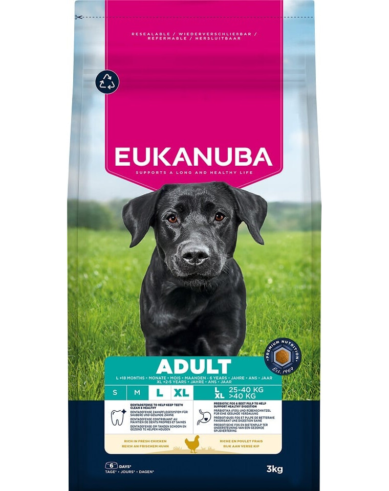 EUKANUBA kuivtoit täiskasvanud koertele, rikkalik värske kana, on 100% täiuslik ja tasakaalustatud ning ideaalne suurtele tõugudele vanuses 18 kuud kuni 6 aastat (või 2–5 aastat hiiglaslike tõugude puhul).