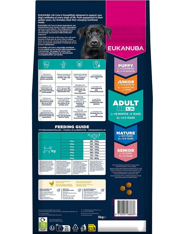 EUKANUBA Life Care on premium toiduliin, mis on välja töötatud teaduslike uuringute põhjal, et täpselt vastata koerte vajadustele igas eluetapis. See retsept on loodud spetsiaalselt täiskasvanud suurte tõugude koertele vanuses 18 kuud kuni 6 aastat (ja hiiglaslike tõugude puhul 2 kuni 5 aastat), kes vajavad dieeti, mis toetab tugevaid lihaseid, terveid liigeseid ja optimaalse kehakaalu säilitamist.