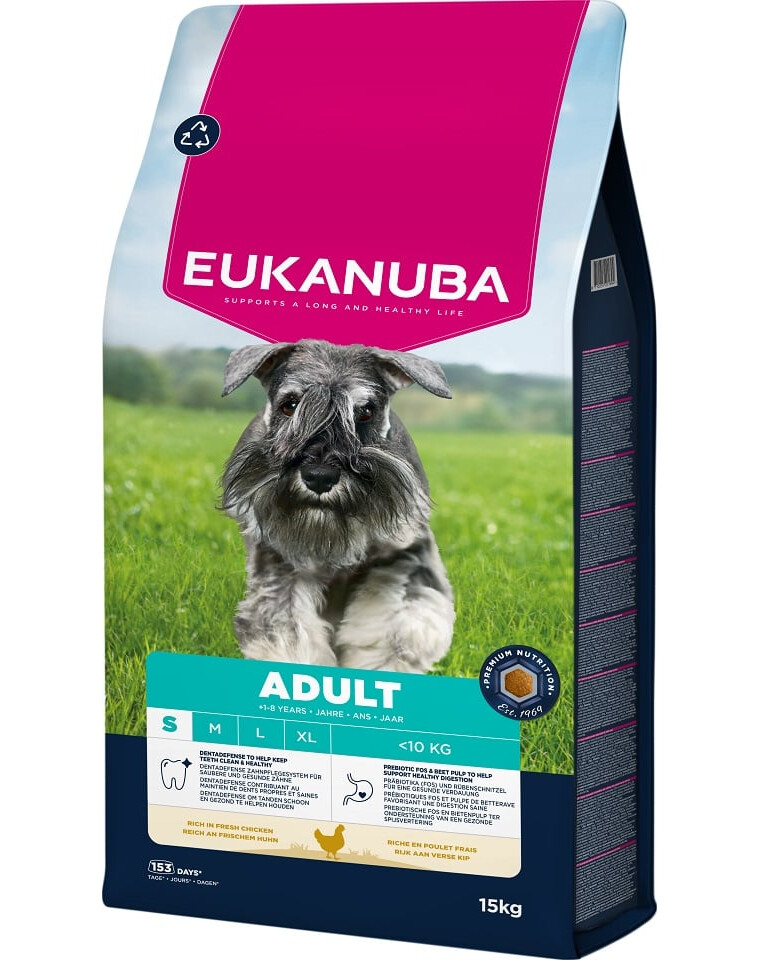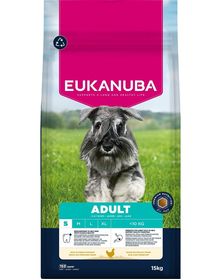 EUKANUBA kuivtoit täiskasvanud koertele, rikastatud värske kanaga, on 100% täiuslik ja tasakaalustatud ning ideaalne väikestele tõugudele vanuses 1 kuni 8 aastat.