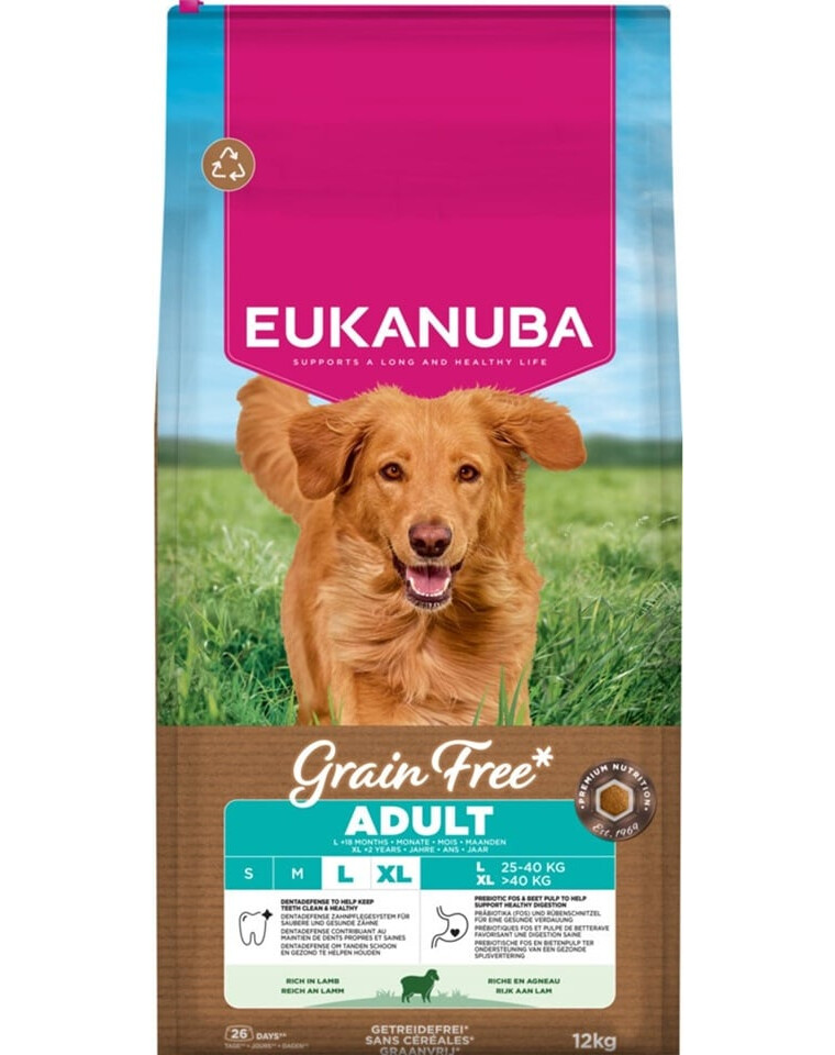EUKANUBA Grain Free Adult Large Lamb on täisväärtuslik, teraviljavaba kuivtoit, mis on spetsiaalselt välja töötatud suurte tõugude täiskasvanud koertele. Retsept on kohandatud nende spetsiifiliste toitumisvajaduste toetamiseks, toetades õiget konditsiooni, seedesüsteemi tervist ning tugevaid luid ja hambaid.