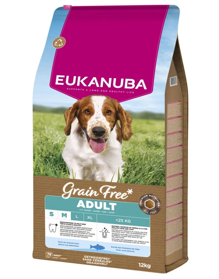 Eukanuba Grain Free on suurepärane valik koertele, kellel on tundlik seedesüsteem, teravilja talumatus või kes vajavad õrna, monoproteiinilist dieeti kalapõhiselt.
