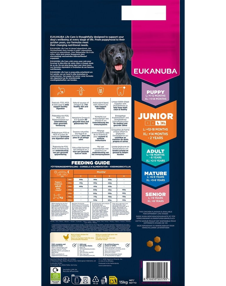 EUKANUBA Life Care on premium klassi toiduseeria, mis on välja töötatud teadusuuringute põhjal, et täielikult rahuldada koera keha muutuvad vajadused igas eluetapis. See retsept on loodud spetsiaalselt noortele suurte tõugude koertele vanuses 12–18 kuud (või 14 kuud–2 aastat hiiglaslike tõugude puhul), mis on periood, mil luustiku ja lihaste areng jätkub ning koer siseneb aeglaselt täiskasvanute ikka.