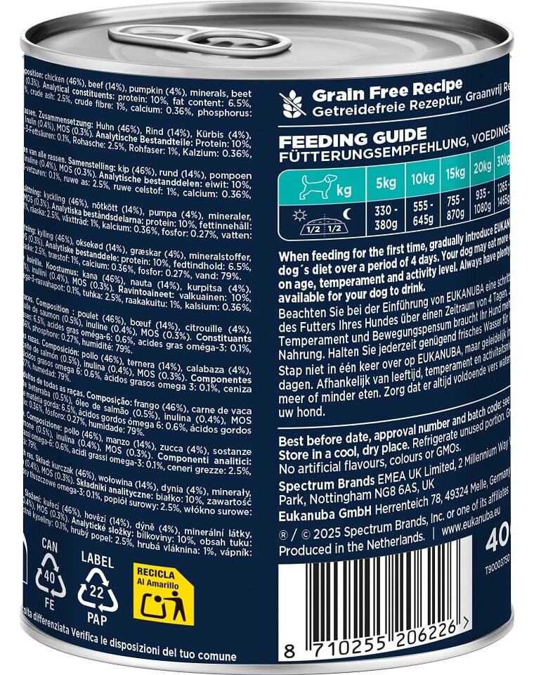 Küpsetis on jämeda tekstuuriga pasteet, mille sees on lihapalad ja köögiviljad, mis suurendab toidu atraktiivsust ja tagab koertele rahuldava konsistentsi. Toode on vaba kunstlikest värvainetest, maitseainetest ja säilitusaineist. Seda saab anda iseseisvalt või koos kuiva toiduga EUKANUBA, luues täisväärtusliku ja maitsva eine.