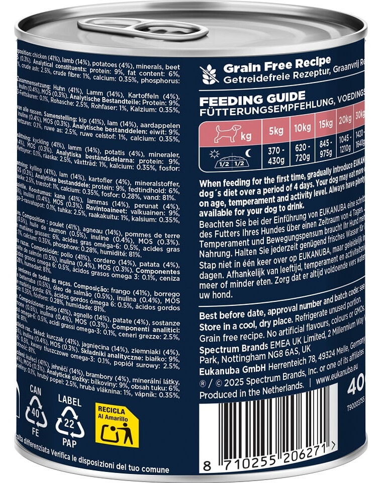 Toit on jämeda pasteedi kujul, millel on selgelt nähtavad lihalõigud ja köögiviljad, mis annab sellele erakordse maitsvuse ja muudab selle koertele väga nauditavaks. Toode ei sisalda kunstlikke värvaineid, maitseaineid ega säilitusaineid. Seda võib anda iseseisvalt või koos kuiva toiduga EUKANUBA, luues tervisliku, toitev ja maitsva eine.