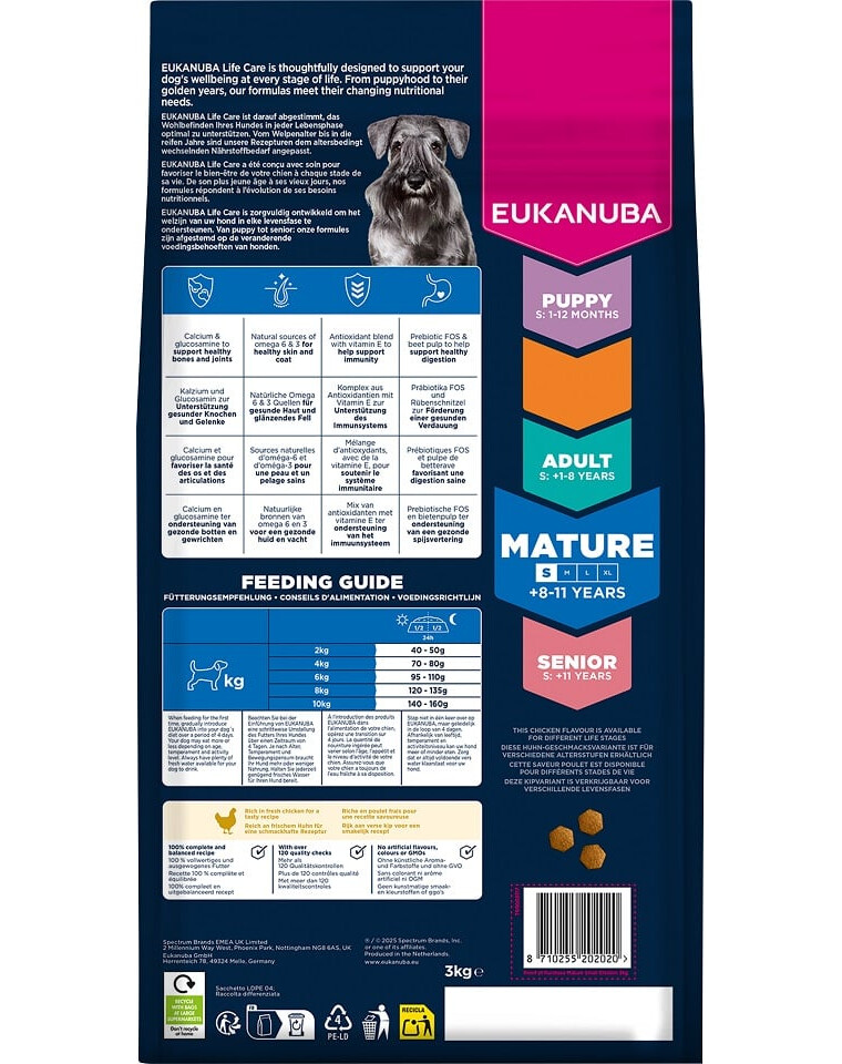 EUKANUBA küpsetele koertele, rikkalik värske kana, on 100% täisväärtuslik ja tasakaalustatud kuivtoit, mis on ideaalne 8–11-aastastele väikestele tõugudele, pakkudes kvaliteetset valku, mis toetab lihaste tugevust ja organismi õiget seisundit.