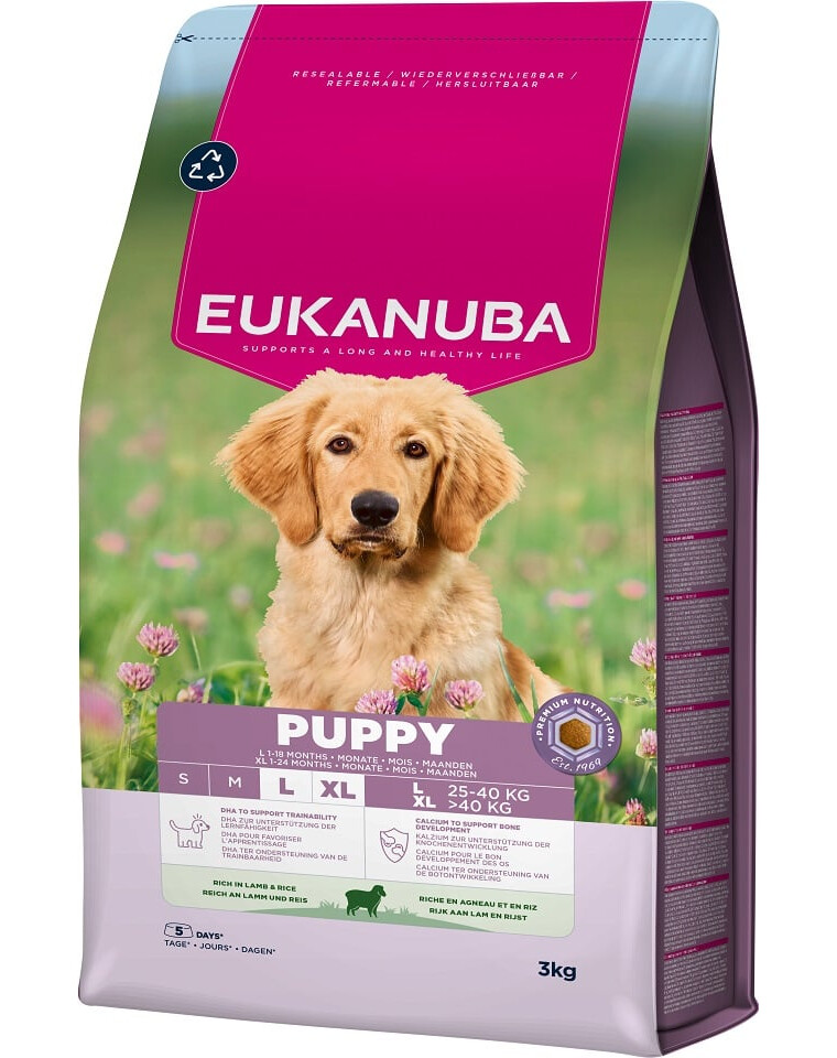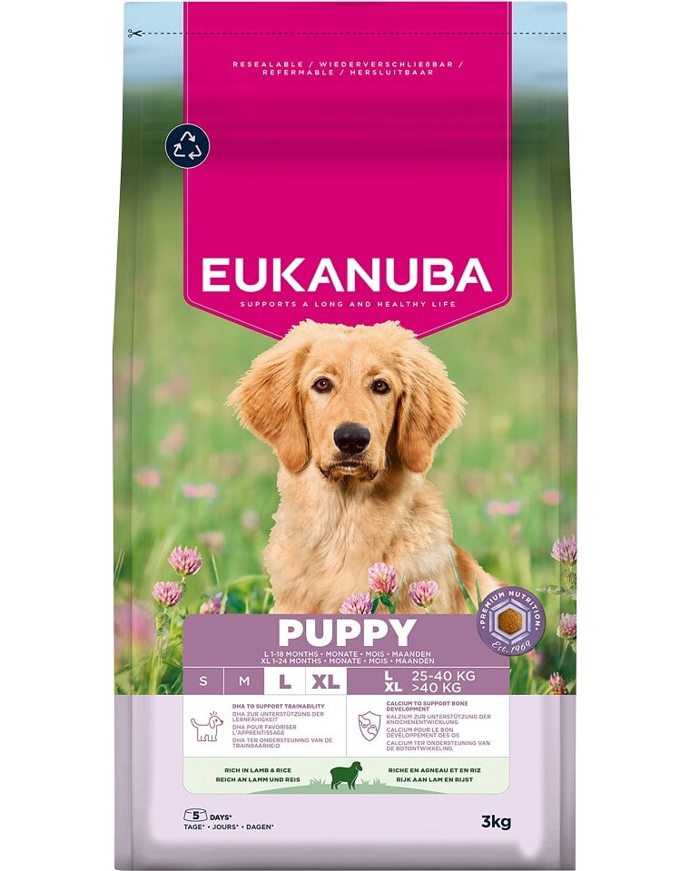 See kuivtoit EUKANUBA kutsikatele, rikka lambaliha ja riisi poolest, on 100% täisväärtuslik ja tasakaalustatud ning ideaalne suurte tõugude jaoks vanuses 1–18 kuud (ja kuni 24 kuud hiiglaslike tõugude puhul).