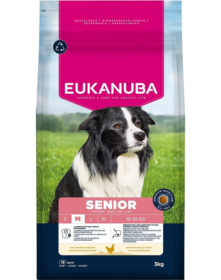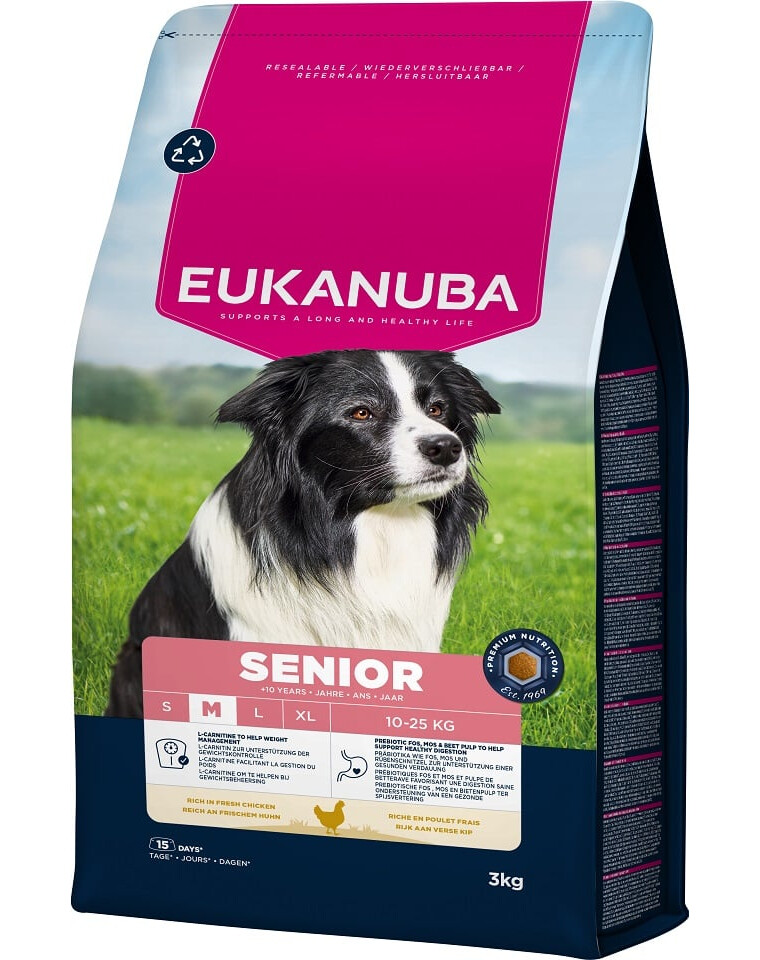 EUKANUBA Life Care on premium toiduseeria, mis on välja töötatud teadusuuringute põhjal, et toetada koerte muutuvat toitumisvajadust igas eluetapis. Erilised koostisosad vanematele keskmise tõu koertele alates 10. eluaastast sisaldavad värsket kana – kvaliteetse valgu allikat, mis toetab lihasmassi ja jõu säilitamist.