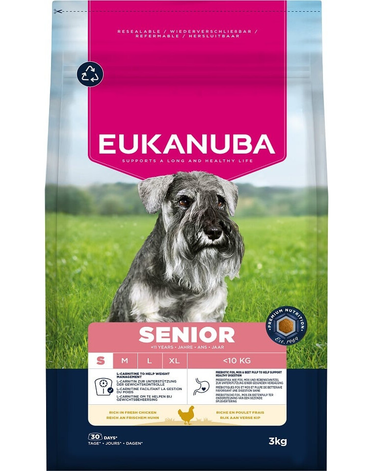 See EUKANUBA kuivtoit vanematele koertele, rikkalik värske kana, on 100% täisväärtuslik ja tasakaalustatud ning ideaalne väikestele tõugudele alates 11. eluaastast.