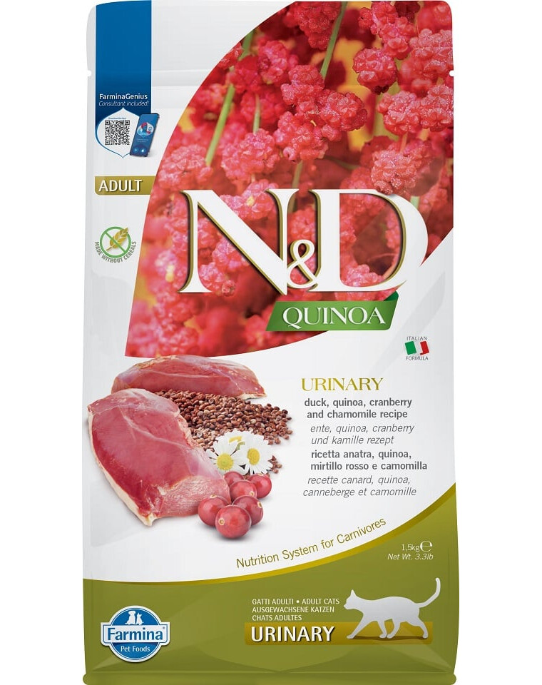Quinoa ei sisalda gluteeni, seda peetakse erakordselt toiteväärtuslikuks toiduks. See toetab toitainete imendumist, on hädavajalike aminohapete, antioksüdantide allikas, omab madalat glükeemilist indeksit ning mõjutab positiivselt südame-veresoonkonna süsteemi. Toidu koostis on välja töötatud kasside jaoks, kes kannatavad kuseteede haiguste all. Valitud koostisosad aitavad toetada neerude normaalset tööd ja hapestada uriini. Jõhvikad vähendavad bakterite kinnitumist kusepõie epiteelile, tänu proantotsüanidiinide olemasolule. Omab uriini hapestamise toetavaid omadusi. Kummel toimib põletikuvastaselt, bakteritsiidsetena, diureetikumina ning ka spasmolüütiliselt. Regulaarne kasutamine aitab vähendada pinget ja rahustab kassi, mis on oluline FLUTD-ga kassi elus.
