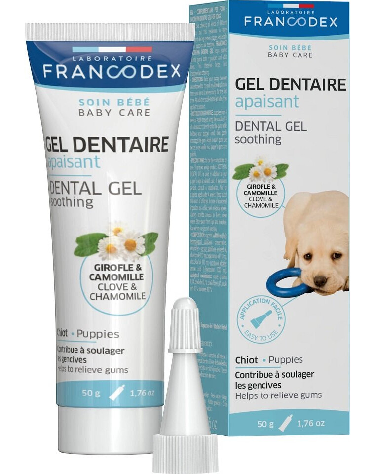 Koertele meeldib asju närida, kuid mõnikord teevad nad seda veelgi intensiivsemalt - eriti kutsikad, kelle hambad on välja kasvamas. FRANCODEX SOOTHING DENTIST GEL aitab vähendada igemete valulikkust nii kutsikal kui ka täiskasvanud koeral. See vähendab koera soovimatut esemete hammustamist.