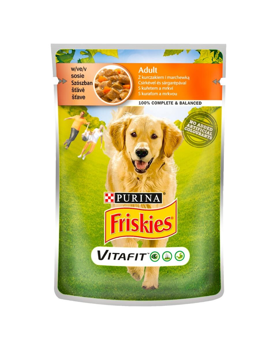 Purina Friskies Adult Vital kana ja porgandiga kastmes, mis on suletud praktilistesse kotikestesse, toetab teie koera tervist. Tagab looma elujõu: kompaktne väljaheide tänu tervislikule seedimisele, läikiv karvkate ja terve nahk, sära silmis - märk tähelepanelikkusest. Annab kõik vajalikud vitamiinid ja toitained hea seisundi säilitamiseks. Ei sisalda kunstlikke värvaineid, lõhna- ja maitseaineid ega säilitusaineid.