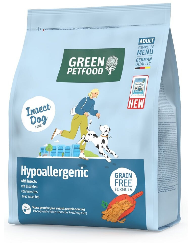 Green Petfood InsectDog Hypoallergen on innovatiivne, gluteenivaba toit, mis on spetsiaalselt välja töötatud täiskasvanud koerte jaoks, kes kannatavad toidutalumatuse ja allergiate all. Ainus loomse valgu allikas on putukad, mis on äärmiselt harva kasutatav ja samas väärtuslik monoproteiin. Tänu sellele vähendab toit allergiliste reaktsioonide riski ja toetab tundlike neljajalgsete õiget seedimist.