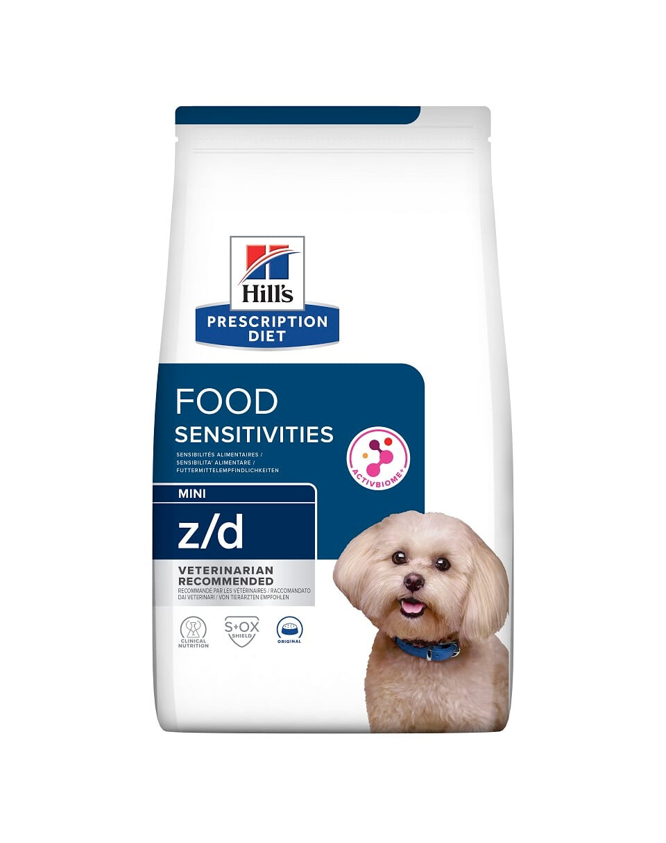 Kuiv toit Hill's PRESCRIPTION DIET z/d Food Sensitivities väikestele koertele on spetsiaalselt välja töötatud Hill'si toitumisteadlaste ja veterinaaride poolt, et vähendada toidutalumatust koertel ning on spetsiaalselt valmistatud väiksema suurusega krõbinate jaoks, et rahuldada väikeste koerte või koerte vajadusi, kes eelistavad väiksemaid krõbinaid.