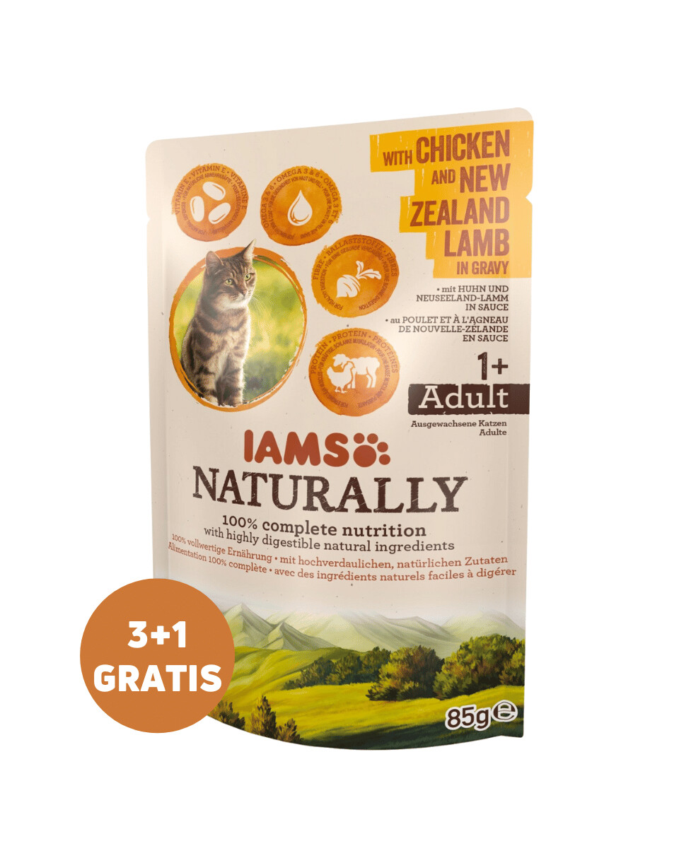 IAMS Naturally täiskasvanud kassidele kana ja Uus-Meremaa lambalihaga kastmes, on niiske kassitoit, mis pakub 100% täisväärtuslikku ja tasakaalustatud toitu. See on valmistatud hoolikalt valitud, hästi seeditavatest koostisosadest, mis muudavad teie lemmikkassi silmnähtavalt tervemaks, tugevamaks ja õnnelikumaks. IAMS Naturally pakub teie kassile palju olulisi eeliseid, pakkudes talle samal ajal rohkelt naudingut söötmise ajal. E-vitamiini lisamine aitab toetada teie kassi loomulikku kaitsevõimet ja immuunsust. Looduslikult saadud Omega-3 ja Omega-6 rasvhapped, toetavad tervet nahka ja karvkatte, kiudained toetavad tervislikku seedimist ja kvaliteetne loomne valk aitab säilitada tugevaid ja rasvata lihaseid.