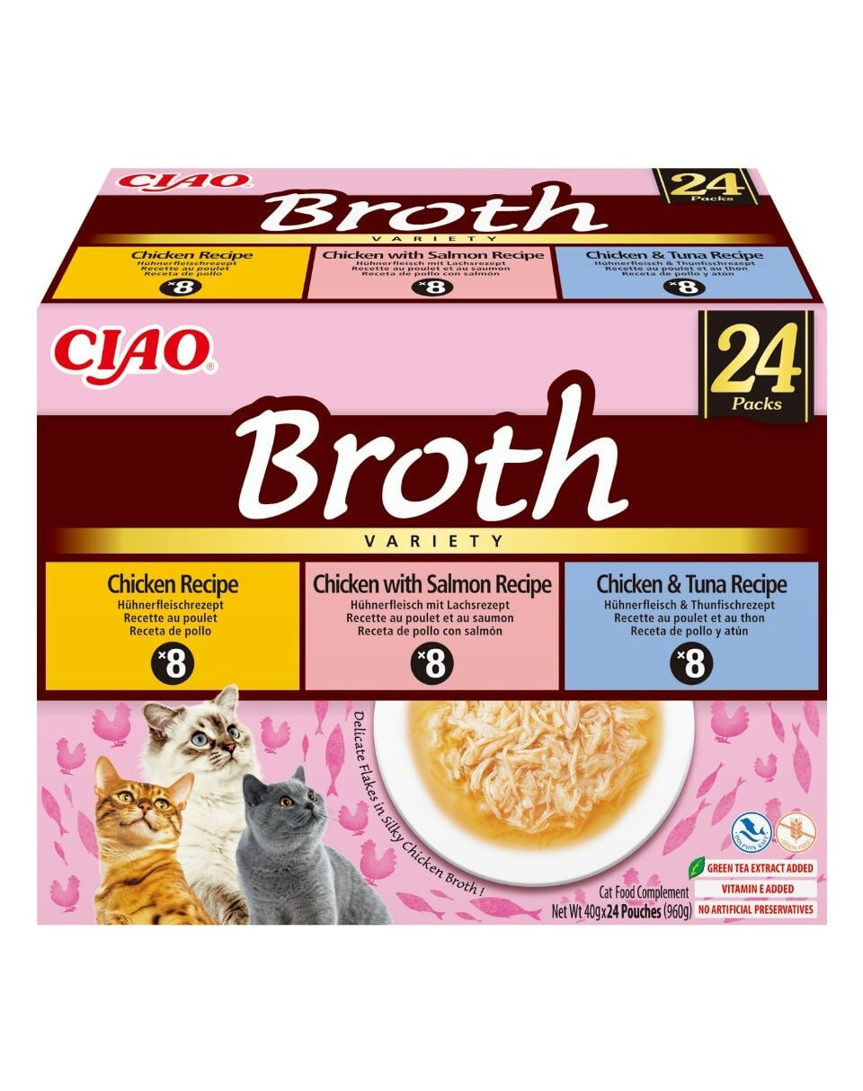 INABA Ciao Broth Variety on ainulaadne, kerge ja aromaatne täiendav toit kassidele, mis on valmistatud õrnade lihalõikude baasil, mis on sukeldatud selgesse, looduslikku puljongisse. „Variety” variant sisaldab erinevaid maitseid — kana, tuunikala ja lõhe — rahuldades isegi kõige valivamaid kasside maitse-eelistusi.