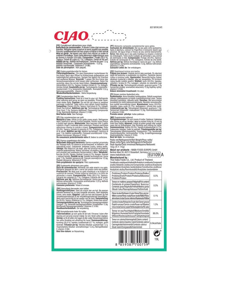 Kana (30,0%), tapiokk, krabiekstrakt (0,7%), kollageen, rohelise tee ekstrakt.