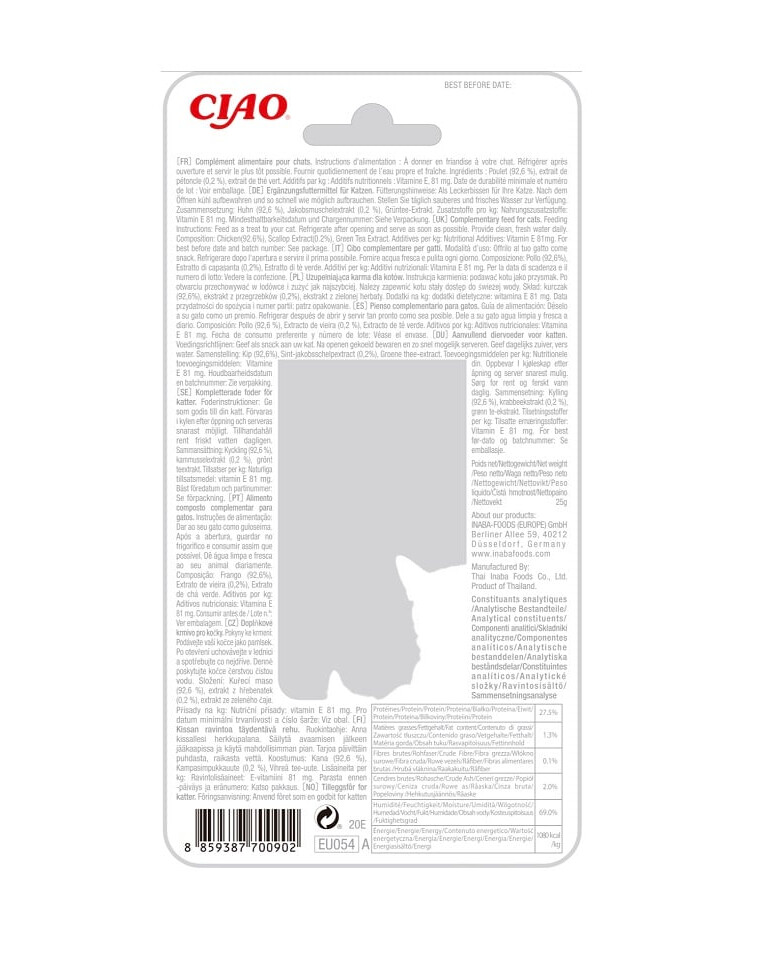 Kana (92,6%), looduslik kammkarpide maitsestatud puljong (kammkarpide ekstrakt 0,2%), rohelise tee ekstrakt, toidu lisaained: E-vitamiin.