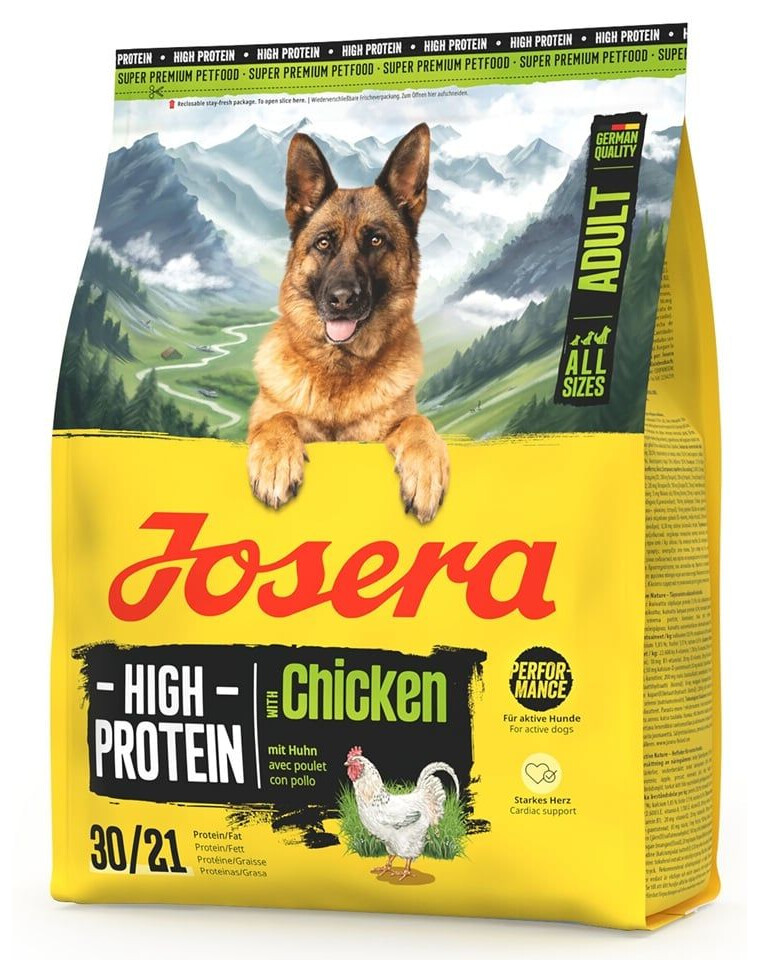 Täisväärtuslik, gluteenivaba kuivtoit, mis on spetsiaalselt välja töötatud täiskasvanud, väga aktiivsete koerte jaoks, sõltumata tõust. JOSERA High Protein Adult Chicken on kõrge valgusisaldusega ja kõrge energia sisaldusega toit, mis pakub optimaalselt vajalikku energiat sportlikele koertele, töötavatele koertele ning tiinetele ja imetavatele emastele. Kana, kui kergesti seeditava valgu allikas, koos hoolikalt valitud toitainetega toetab vastupidavust, jõudu ja kiiret taastumist pärast pingutust.