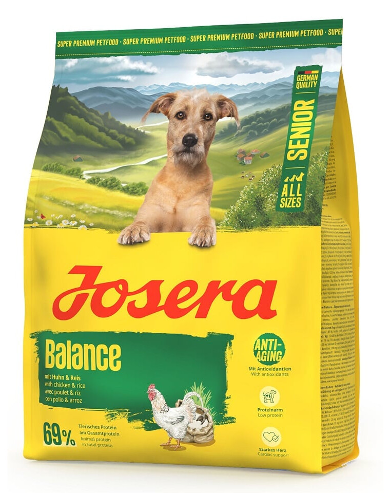Kohandatud vanade koerte vajadustele: Josera Balance on spetsiaalne toit suurema elujõu tagamiseks vanemas eas. Madalam rasva- ja valgusisaldus aitab vähendada koera ainevahetuse koormust. Hästi talutav ja tasakaalustatud koostis ei sisalda gluteeni ning võib aidata rakke vananemise vastu tänu väärtuslikele antioksüdantidele, nagu vitamiinid E ja C ning tauriin. Kuna Balance on ka madala fosforisisaldusega toit, võib see samuti kergendada elundeid vanemas eas. Tänu oma spetsiaalsele koostisele võib madala rasvasisaldusega toit olla ka hästi talutav alternatiiv vähem aktiivsetele koertele, kes pole veel vanadusse jõudnud. Toidu maitsvuse tagamiseks sisaldab retsept maitsvat kana ja riisi.