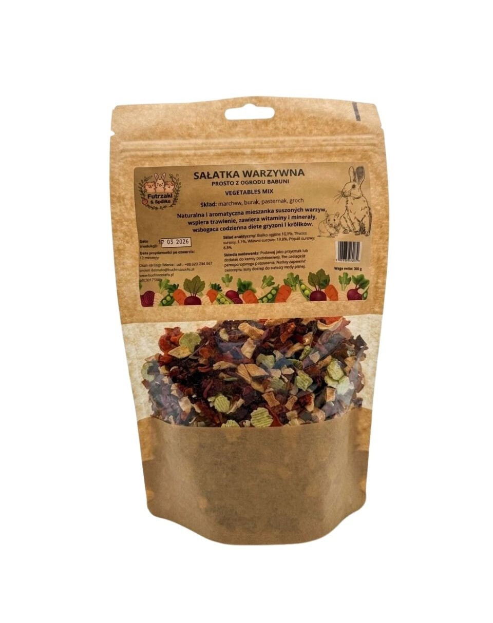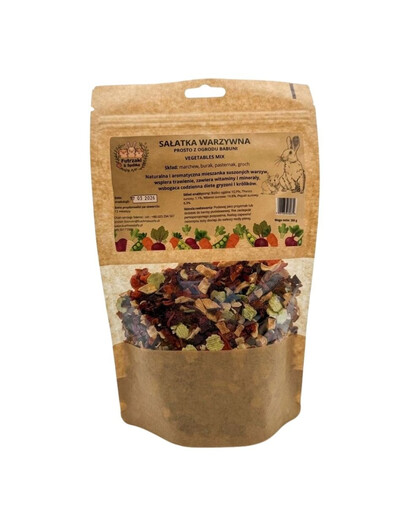 Köögivilja- ja puuviljasalat „Otse vanaema aiast” on hoolikalt koostatud kuivatatud köögiviljade ja puuviljade segu, mis toetab näriliste ja küülikute tervist ja heaolu.