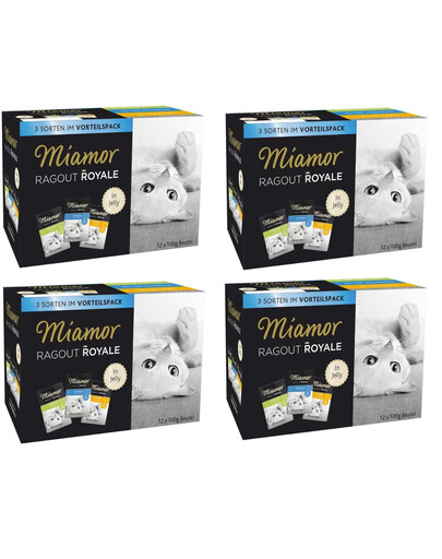 Miamor Ragout Royales Jelly 12×100g täissööt, sortiment: küülik, tuunikala ja kana. Hästi seeditavad lihatükid maitsvas želees täiskasvanud kassidele. Täistoit, toit sisaldab kõike, mida teie kass vajab. Valmistatud tootmisprotsessiga, mis säilitab toorainete toiteväärtuse ja vitamiinid, seega on tööstuslikke vitamiine lisatud mõõdukalt. Ei sisalda veiseliha, värvaineid ega säilitusaineid.