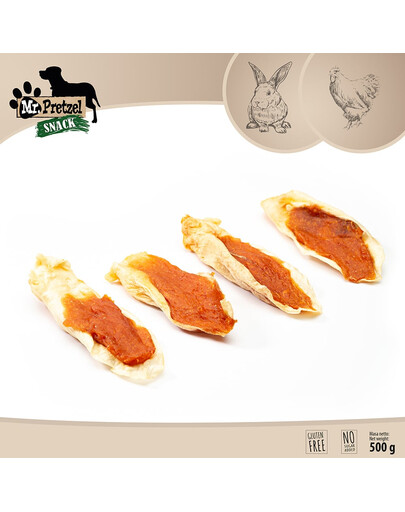 Mr. Pretzel Küülikukõrvad kana 500g on kõrge kvaliteediga, äärmiselt maitsvad, lihased maiustused teie neljajalgsele sõbrale. Mr. Pretzel maiustuste sari võimaldab teil hellitada oma lemmikut tervisliku, funktsionaalse ja mugava suupistega. Tänu kvaliteetsete koostisosade kasutamisele pakuvad nad hästi omastatavat loomset valku, toetades teie koera tervet arengut. Mr. Pretzel maiustusi saab kasutada nii preemiana treeningu ja mängu ajal kui ka maitsva suupistena.