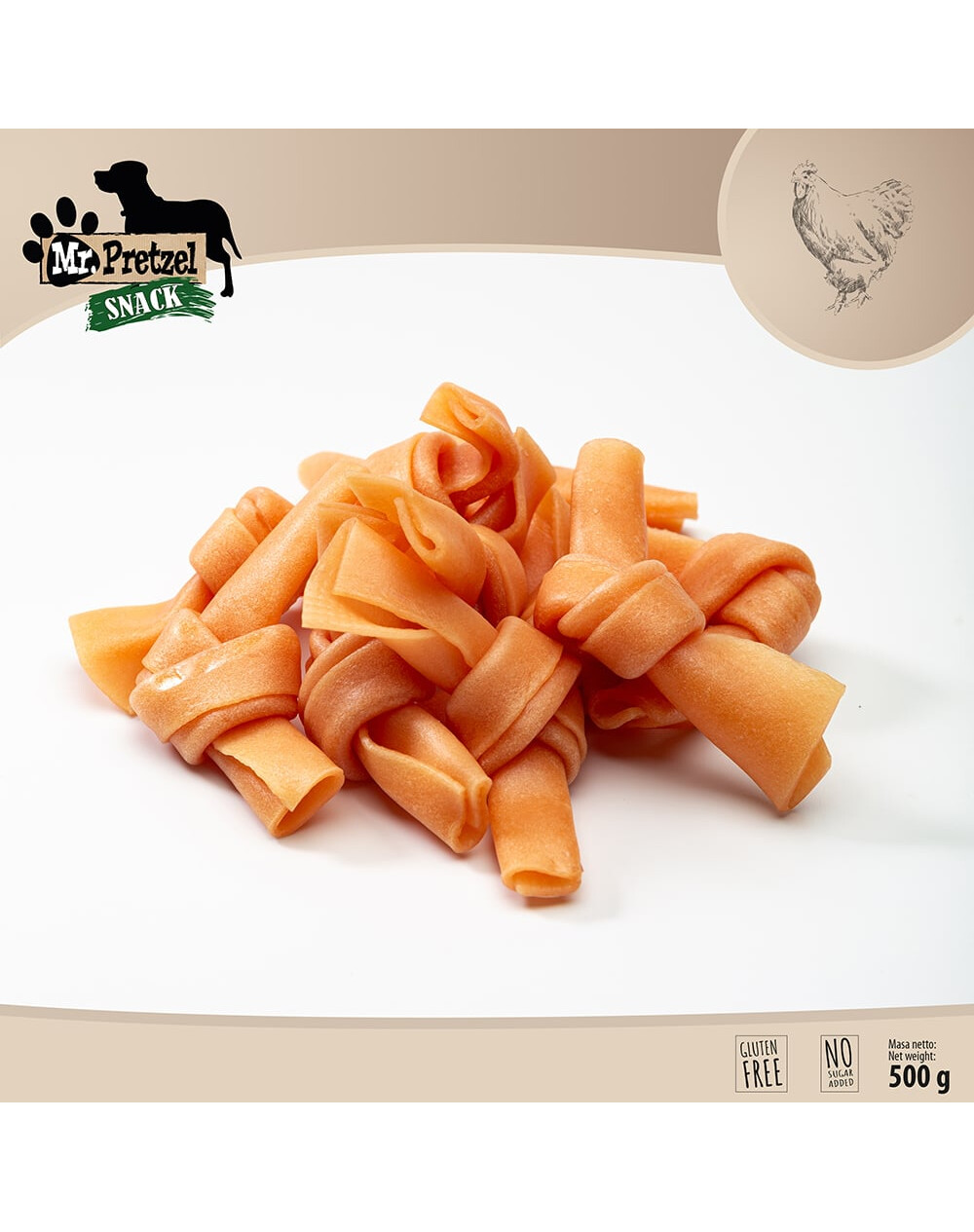 Mr. Pretzel Pehmed kana sõlmed 500g on kõrge kvaliteediga, äärmiselt maitsvad, lihased maiustused teie neljajalgse sõbra jaoks.