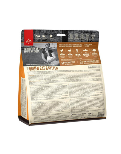 Orijeni spetsialistide loodud uuenduslik koostis põhineb valgurikastel loomsetel toodetel. Orijen Cat & Kitten on toit, mis koosneb 85% ulatuses liha koostisosadest. Nende hulka kuuluvad värske ja terve liha kanast, kalkunist - nende maksast ning terve ja värske kala, nagu lest ja heeringas. Neid on täiendatud kalkuni- ja kanasüdamega. Ülejäänud 15% koostisest moodustavad puu- ja köögiviljad, mis on valitud nii, et saada maksimaalne annus vitamiine ja täiendavaid aineid - porgandid, punased õunad, peet, jõhvikad, kõrvitsad kahes variandis, pirnid ja mustikad. Spetsiifilise aroomi annavad lavendel ja roosiõied. Toit on universaalse iseloomuga, st sobib nii kassidele, kes veedavad suurema osa oma ajast siseruumides, kui ka aktiivse eluviisiga kassidele. Orijen ei sisalda teravilja, mis on veelgi tõhusam igapäevaste energiavarude suurendamiseks.