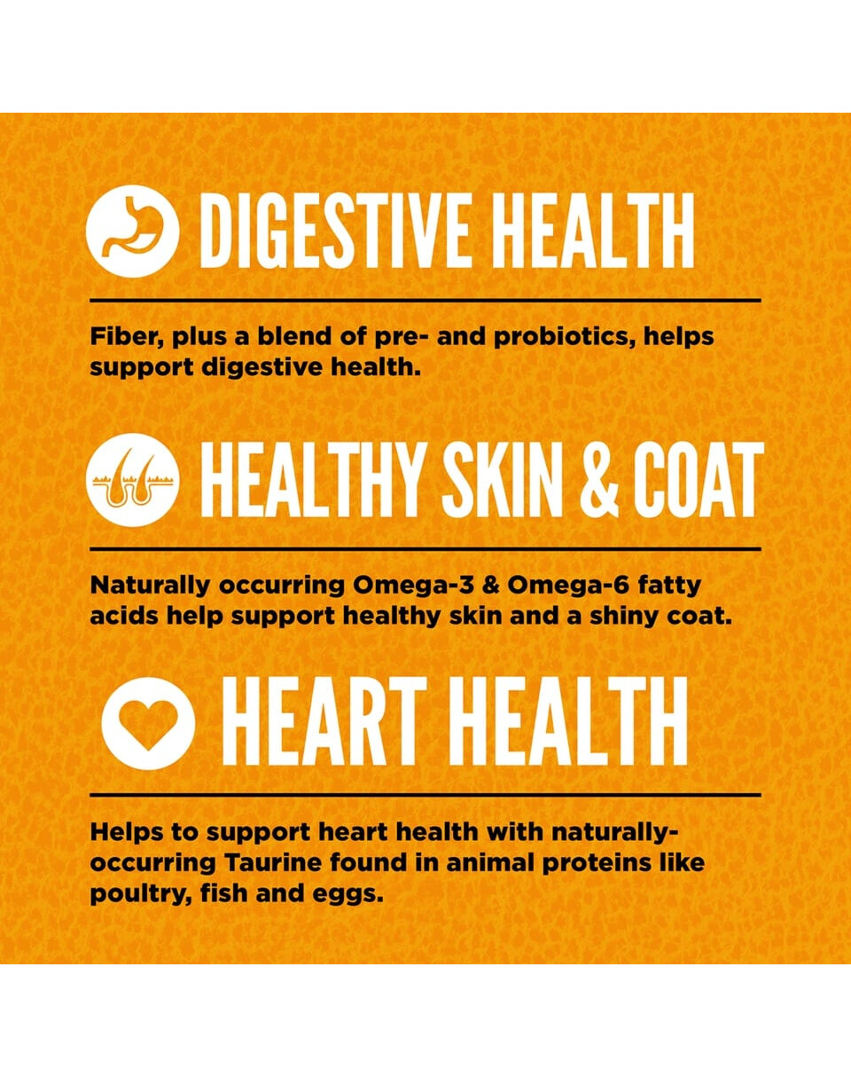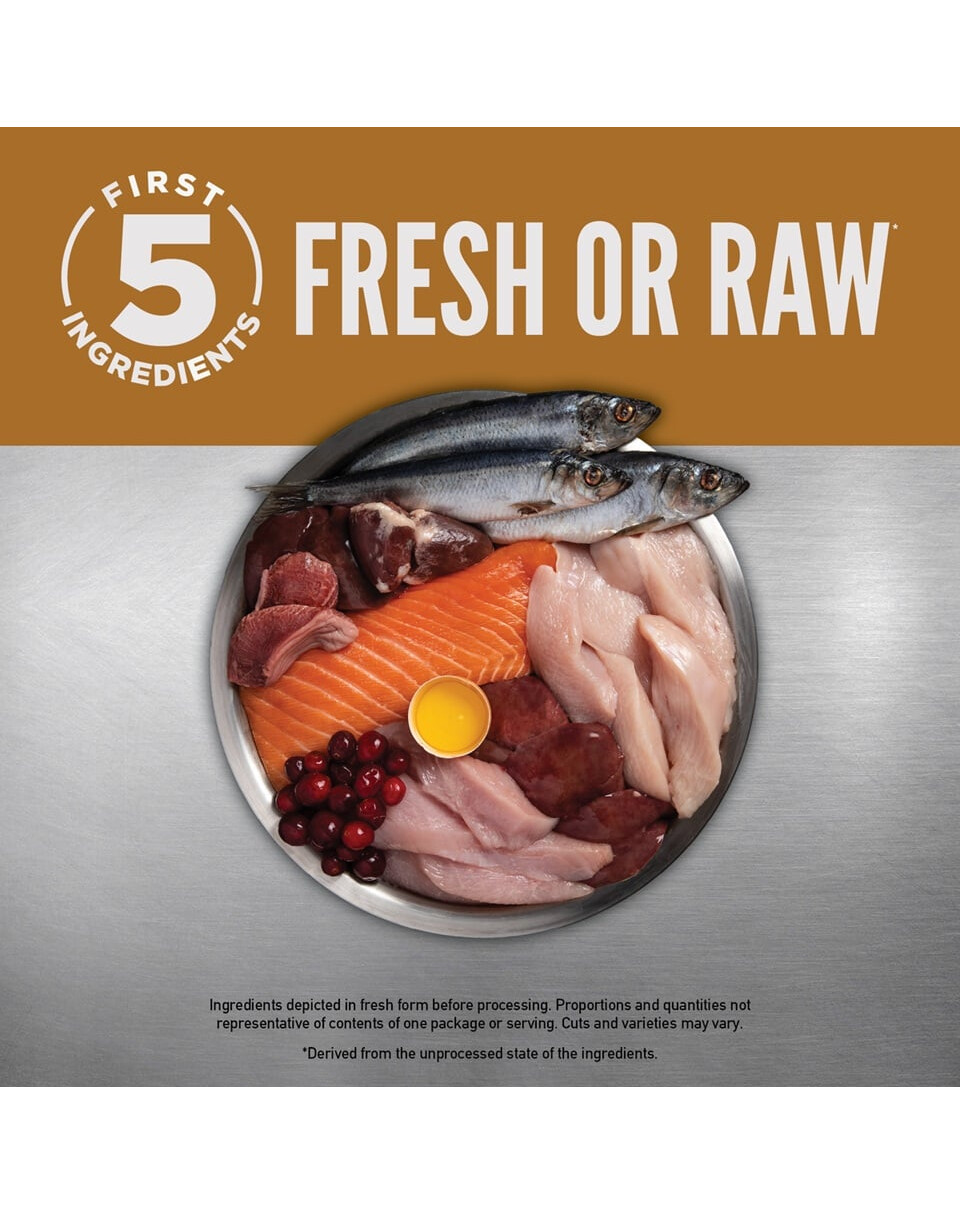 värske kanaliha (18%), värske kalkuniliha (7%), värske terve muna (5%), värske kanamaks (5%), värske terve lesta (4%), värske terve heeringas (4%), värske kalkunimaks (4%), värske kanasüda (4%), värske kalkunisüda (4%), värske kanakael (4%), kana (dehüdreeritud, 4%), kalkun (kuivatatud, 4%), terve makrell (kuivatatud, 4%), terve sardiin (kuivatatud, 4%), terve heeringas (kuivatatud, 4%), kanarasv (3%), terved punased läätsed, terved rohelised herned, terved rohelised läätsed, terved kikerherned, terved kollased herned, läätsekiud, terved pinto oad, terved valged oad, kanakondid (dehüdreeritud, 1%), heeringaõli (1%), kanamaks (külmkuivatatud), kalkunimaks (külmkuivatatud), värske terve kõrvits, värske terve muskus, värske terve suvikõrvits, värske terve pastinaak, värske porgand, värske terve punane maitsev õun, värsked terved bartlettpirnid, värske lehtkapsas, värske spinat, värsked peedilehed, värsked naeriselehed, pruunvetikas, terved jõhvikad, terved mustikad, terved saskatoonmarjad, sigurijuur, kurkum, piimanõges, hariliku juur, hariliku juur, lavendlilill, valerianijuur, roosimarja. Toidulisandid: tsink, vask, koliin.