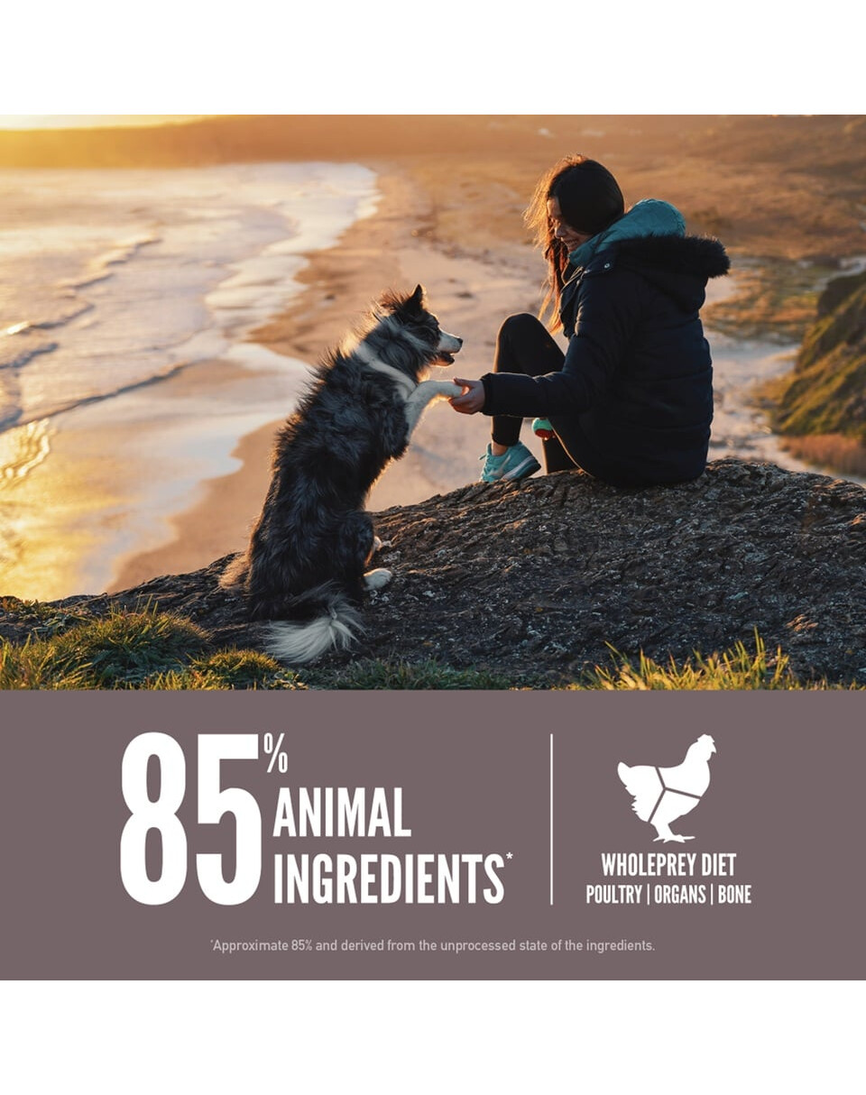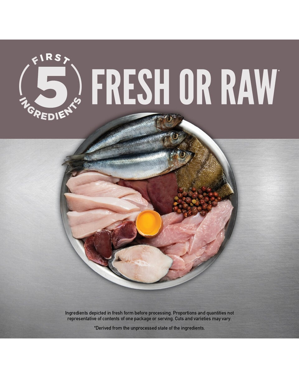 Värske kana (25%), toores terve heeringas (6%), toores kalkun (6%), värske kana rups (maks, süda) (6%), toores terve merluus (5%), toores terve makrell (5%) ), värsked munad (5%), veetustatud kana (4%), veetustatud makrell (4%), dehüdreeritud sardiin (4%), veetustatud heeringas (4%), veetustatud kalkun (4%), veetustatud siig (4%). Läätsekiud, terved pintooad, terved mereoad, terved kikerherned, terved punased läätsed, terved rohelised läätsed, terved herned, hernetärklis, toores kalkunimaks (1,5%), kanarasv (1,5%), õunakiud, vetikad (allikas) DHA), kuivatatud merevetikad, terve värske kõrvits, terve värske kõrvits, terve värske suvikõrvits, terve värske porgand, terve värske õun, terve värske pirn, kuivatatud sigurijuur, värske lehtkapsas, värske spinat, värske peet, värske kaalikas, terved jõhvikad, terved mustikad, terved saskatooni marjad, kurkum, piimaohakas, takjajuur, lavendel, vahukomm, kibuvitsamarjad.