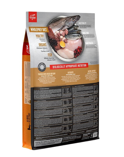 värske kanaliha (18%), värske kalkuniliha (7%), värsked terved munad (5%), värske kanamaks (5%), värske terve lesta (4%), värske terve heeringas (4%), värske kalkunimaks (4%), värske kanasüda (4%), värske kalkunisüda (4%), värske kanakael (4%), kana (kuivatatud, 4%), kalkun (kuivatatud, 4%), terve makrell (kuivatatud, 4%), terved sardiinid (kuivatatud, 4%), terve heeringas (kuivatatud, 4%), kanarasv (3%), terved punased läätsed, terved rohelised herned, terved rohelised läätsed, terved kikerherned, terved kollased herned, läätsekiud, terved pinto oad, terved valged oad, kanakondid (dehüdreeritud, 1%), heeringaõli (1%), kanamaks (külmkuivatatud), kalkunimaks (külmkuivatatud), värske terve kõrvits, värske terve muskus, värske terve suvikõrvits, värske terve pastinaak, värske porgand, värske terve punane maitsev õun, värsked terved bartlettpirnid, värske lehtkapsas, värske spinat, värsked peedilehed, värsked naeriselehed, pruunvetikas, terved jõhvikad, terved mustikad, terved saskatoonmarjad, sigurijuur, kurkum, piimanõges, hariliku juur, hariliku juur, lavendliõied, valerianijuur, roosamahlad. Toidulisandid: tsink, vask, koliin.