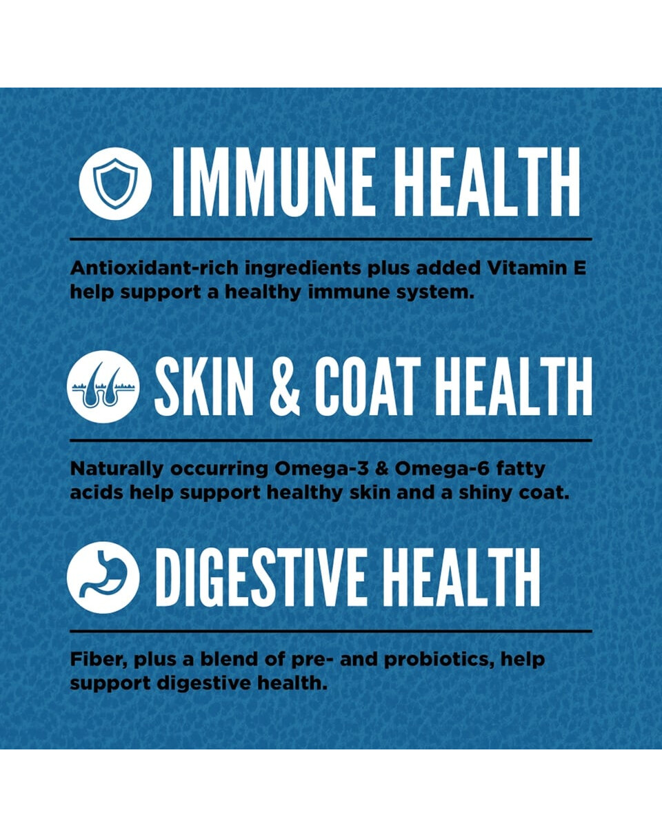 Teraviljavaba kuiv täistoit igas vanuses koertele. Retsept põhineb praegustel teadmistel koerte toitumise kohta ja on koostatud meie esivanemate toitumise eeskujul. See sisaldab rohkelt liha, sealhulgas kala (85%), väheseid süsivesikuid ja köögivilju ning, mis kõige tähtsam, ei sisalda suhkrut. Kaks kolmandikku kasutatud koostisosadest on värsked, üks kolmandik on kuivatatud. Selline jaotus annab väärtuslikke aminohappeid, mis imenduvad koera organismis kõige kiiremini ja tõhusamalt. Loomset päritolu valgud kiirendavad lihaste ja luude taastumist. Köögiviljad, nagu läätsed: punased ja rohelised, kõrvitsad erinevates sortides, rohelised herned ja pinto ja haricot oad, maitsetaimed ja puuviljad: õunad, pirnid, mustikad või jõhvikad, annavad vitamiine ja mineraalaineid.