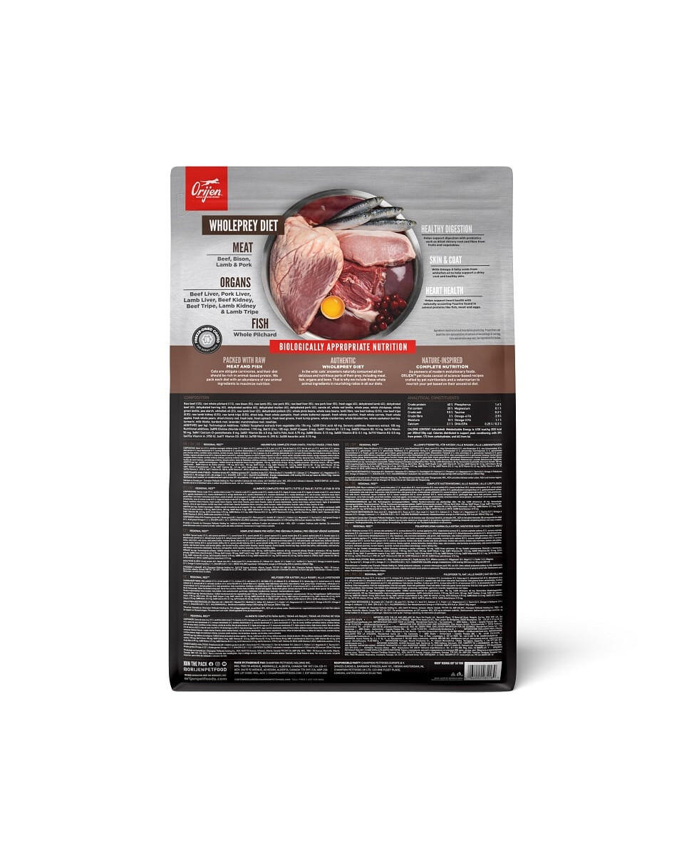 Toores veiseliha (13%), toores terved sardiinid (11%), toores piisoniliha (5%), toores lambaliha (5%), toores sealiha (5%), toores veiseliha maks (5%), toores sealiha maks (5%), värsked munad (4%), dehüdratiseeritud lambaliha (4%), dehüdratiseeritud veiseliha (4%), dehüdratiseeritud heeringas (4%), dehüdratiseeritud sardiin (4%), dehüdratiseeritud lambaliha (4%), dehüdratiseeritud sealiha (4%), rapsiõli, terved punased läätsed, terved herned, terved kikerherned, terved rohelised läätsed, hernestärklis, siioõli (2%), toores lambamaks (2%), kuivatatud tursik (2%), terved pinto-oad, terved tavalised oad, läätsed kiudained, toores veiseliha neerud (0,5%), toores veiseliha magu (0,5%), toores lambamaks (0,5%), toores lambamaks (0,5%), kuivatatud merevetikad, värske terviklik kõrvits, värske terviklik muskaatkõrvits, värske terviklik suvikõrvits, värske terviklik porgand, värske terviklik õun, värske terviklik pirn, kuivatatud sigurijuur, värske lehtkapsas, värske spinat, värske lehtpeet, värske naeris, terved jõhvikad, terved mustikad, terved sordid, kurkum, piimjuur, naerisjuur, lavendel, meditsiiniline malts, loodusliku roosi viljad.