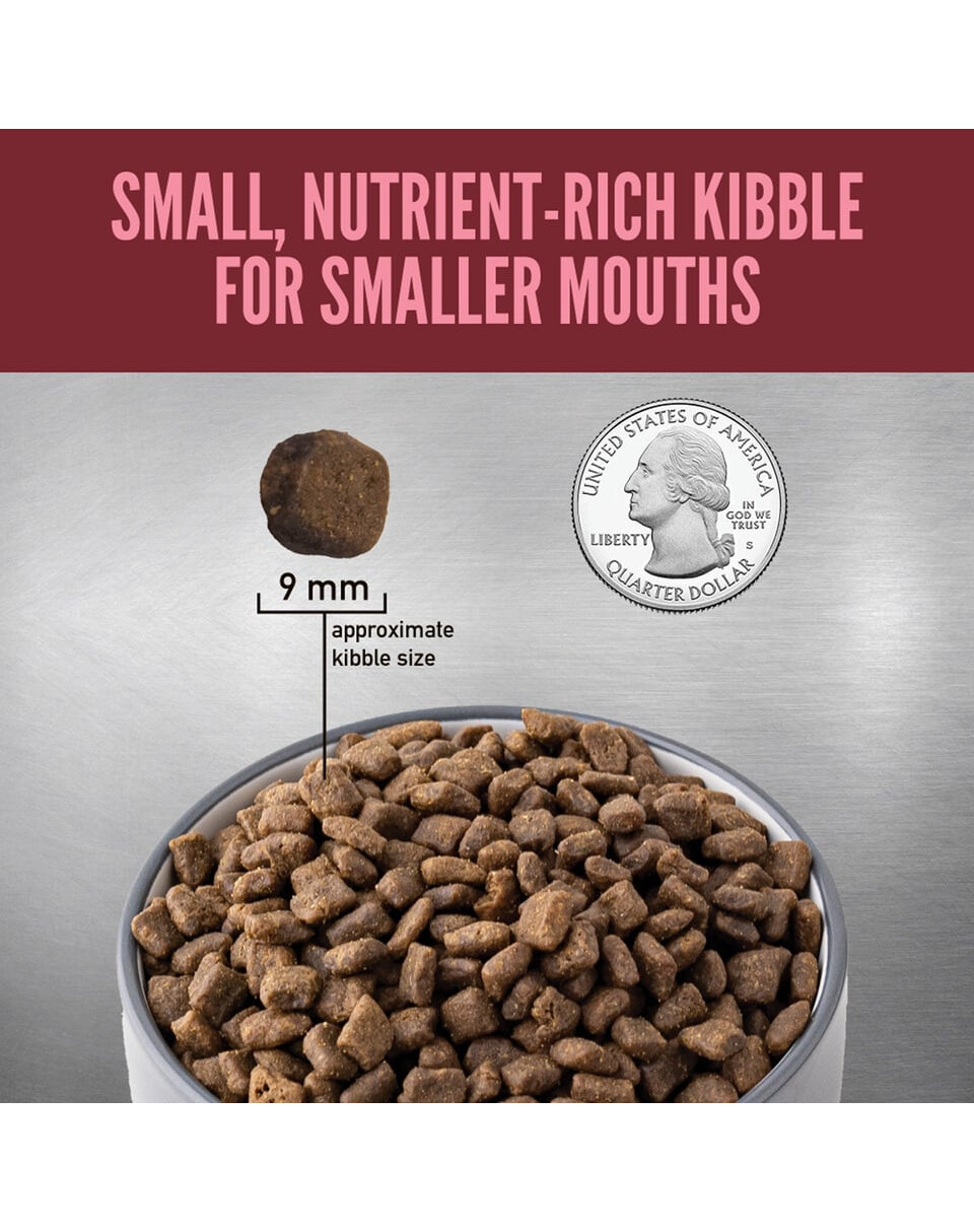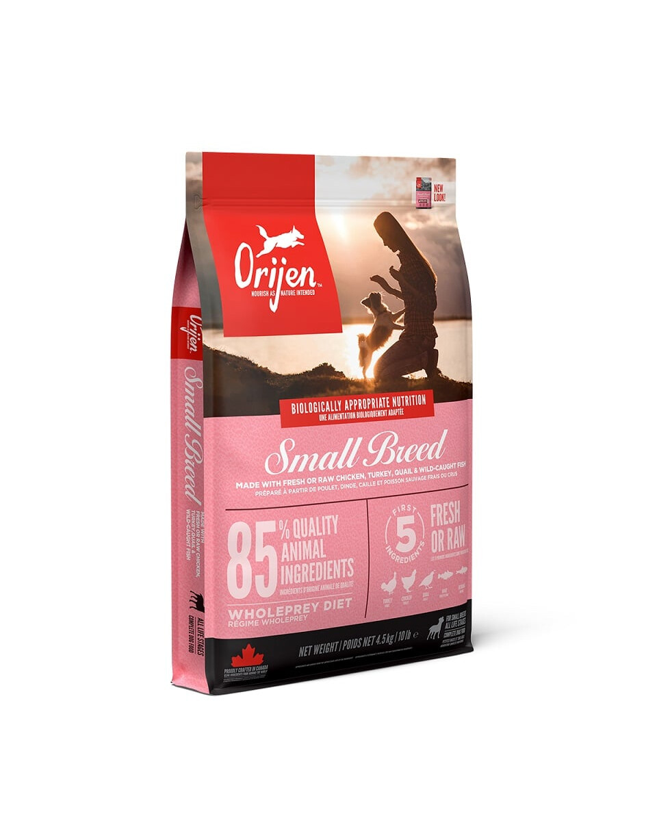 Orijen Small Breed sisaldab rohkelt kalkunit, kana, vutti, barnamune ja kala. Toit on spetsiaalselt koostatud väiksematele koertele. Väikesemõõdulised krõpsud on väikestele koertele kergemini tarbitavad. Väikeste tõugude valemis sisalduvad liha koostisosad on saadud väikestest loomaliikidest, mis peegeldab väikeste tõugude evolutsioonilist toitumist.