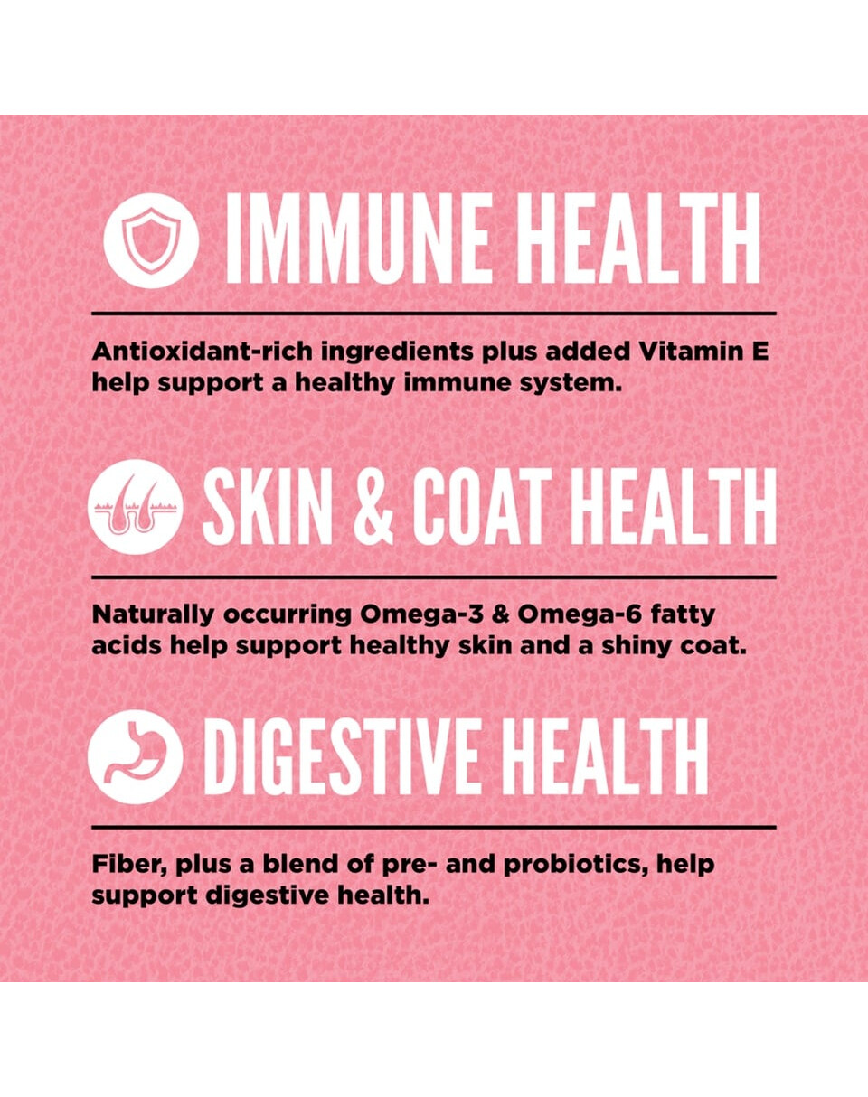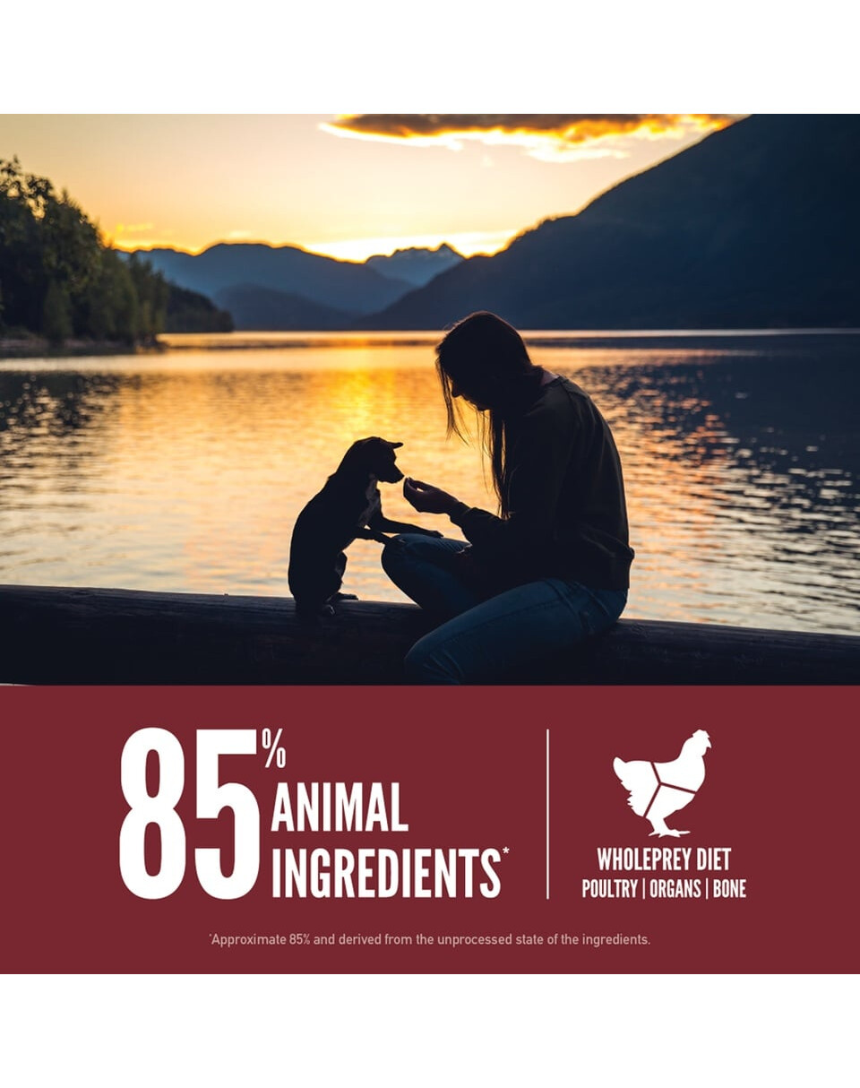 Toores kalkun (19%), värske kana (18,5%), toores vutt (4%), toores merluus (4%), toores heeringas (4%), toores kalkunimaks (4%), värske kana rups (maks, süda) ) (4%), värske muna (4%), veetustatud kalkun (4%), veetustatud kana (4%), dehüdreeritud heeringas (4%), veetustatud kanamaks (4%), veetustatud muna (4%), terve punased läätsed, terved pintooad, terved rohelised läätsed, kanarasv (3%), terved mereoad, terved kikerherned, läätsekiud, terved herned, pollockiõli (0,5%), hernetärklis, kuivatatud merevetikad, rohelised Uus-Meremaa rannakarbid, terved värske kõrvits, terve värske kõrvits, sool, terved värsked õunad, terved värsked porgandid, terved värsked pirnid, terve värske suvikõrvits, kuivatatud sigurijuur, värske punapeet, värske lehtkapsas, värske spinat, värske naeris, terved jõhvikad, terved mustikad, terve saskatoon marjad, kurkum, piimaohakas, takjajuur, lavendel, vahukomm, kibuvitsamarjad.