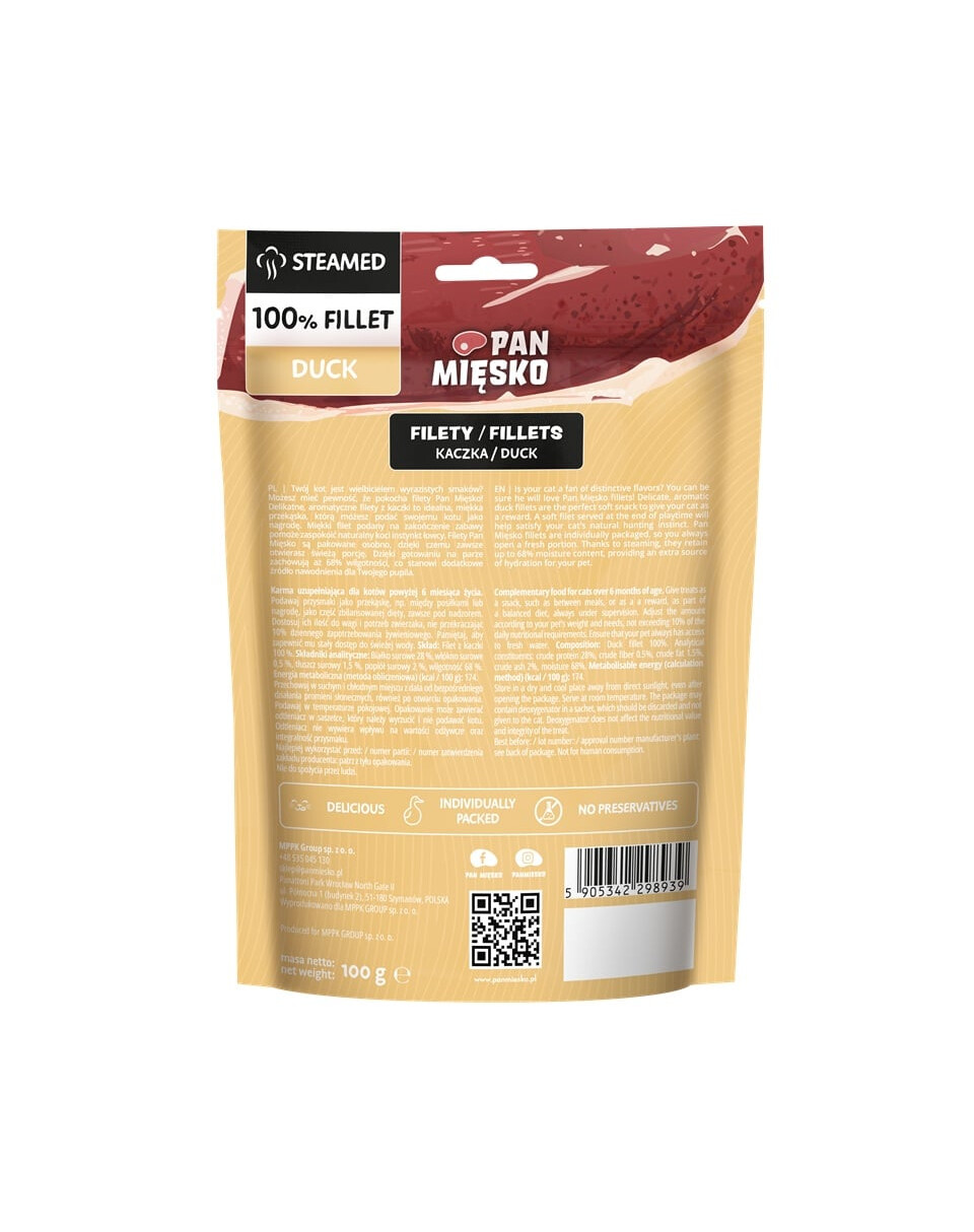 Kas sinu kass armastab intensiivseid maitseid? Sa võid olla kindel, et ta armastab PAN MIĘSKO fileesid! Pehmed, aromaatsed kana fileed on ideaalne, pehme suupiste, mida saad oma kassile preemiaks anda. Pehme filee, mis antakse mängu lõpetamiseks, aitab rahuldada kasside loomulikku jahimehe instinkti. PAN MIĘSKO fileed on pakendatud eraldi, nii et avad alati värske portsjoni. Auru keetmine säilitab kuni 68% niiskust, mis on täiendav vedelikku allikas sinu lemmikloomale.