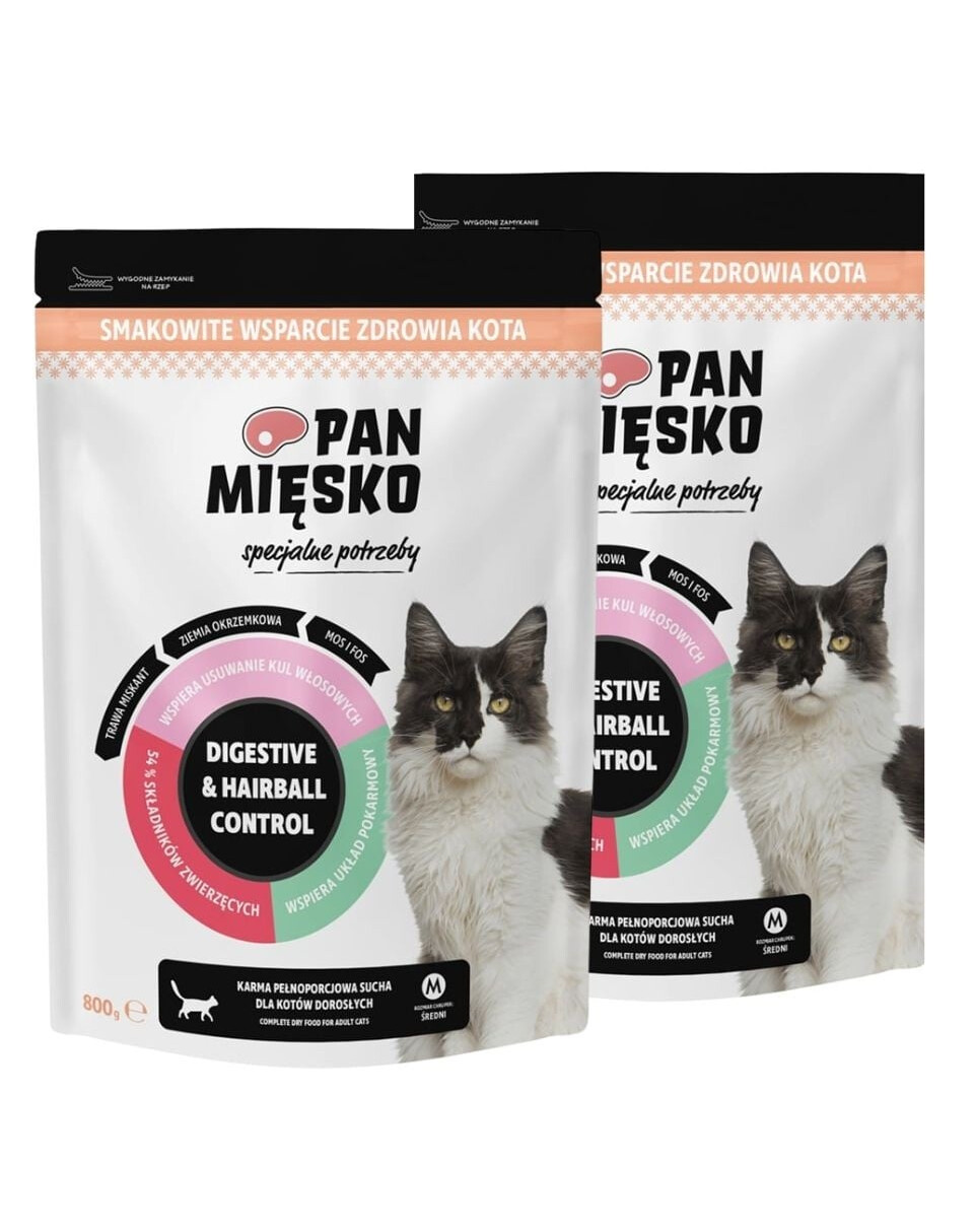 Pan Mięsko Digestive & Hairball Control on ideaalne lahendus täiskasvanud kassidele, kes kannatavad seedeprobleemide või karvapallide tekkimise all. Kõrge 54% loomsetest koostisosadest – sealhulgas õrn kalkun ja aromaatne lõhe – tagab suurepärase maitse ja kvaliteetse valgu, mis toetab kassi heaolu ja tervist.