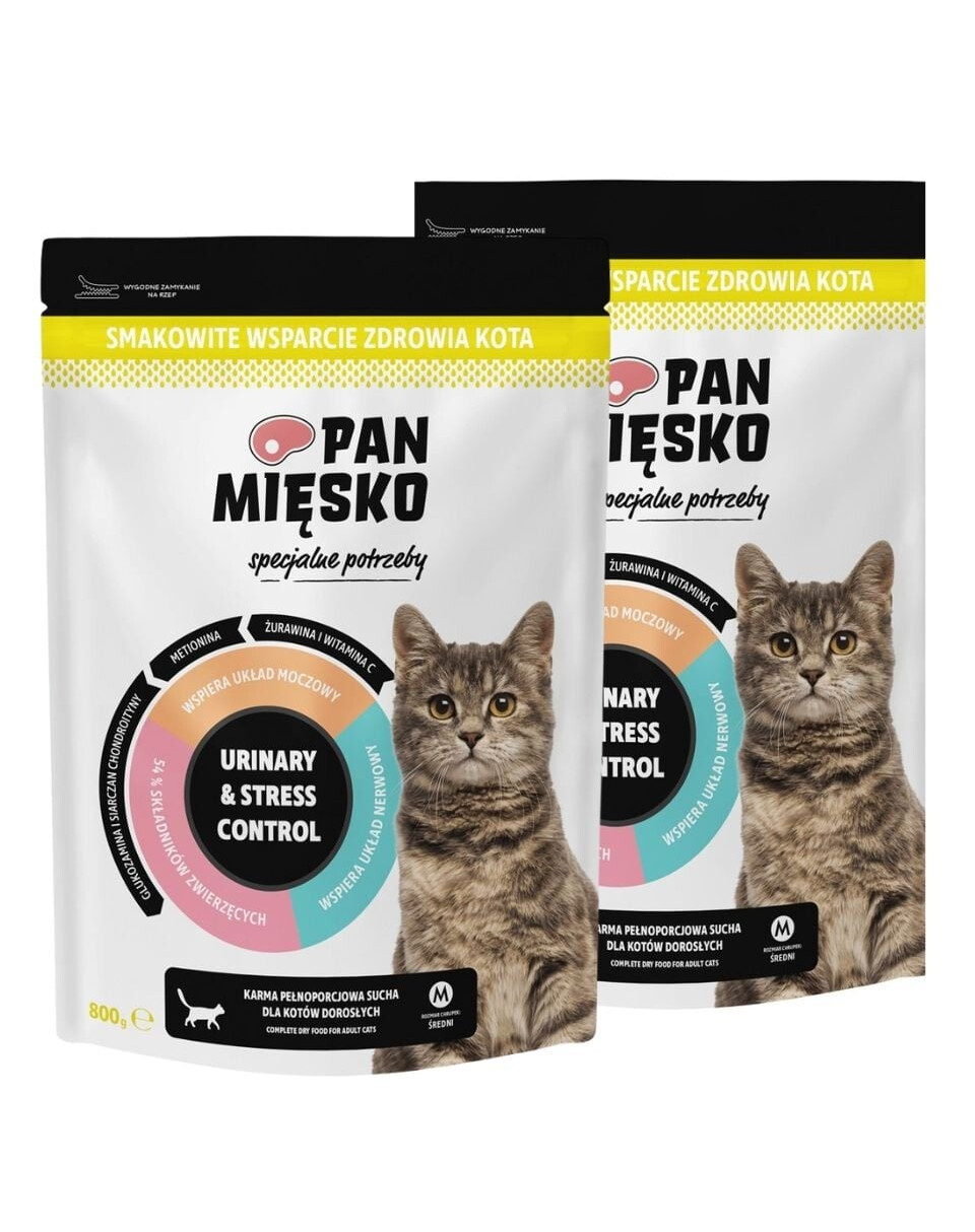 Urinary toidud kassidele, kellel on kuseteede probleemid. Rahu, tervis ja igapäevane mugavus teie kassi jaoks! Mõned kassid on eriti vastuvõtlikud stressile – ja just see võib olla üks põhjusi kuseteede probleemide tekkeks. Seetõttu on loodud Pan Mięsko – Urinary & Stress Control – kuiv toit, mis on mõeldud täiskasvanud kassidele, kes vajavad toetust nii emotsioonide kui ka kuseteede tervise osas. 54% loomsetest koostisosadest, õrnad lihad (kalkun ja veiseliha), funktsionaalsed lisandid ja ürdid teevad sellest suurepärase valiku tundliku närvi- ja kuseteede süsteemiga kassidele.