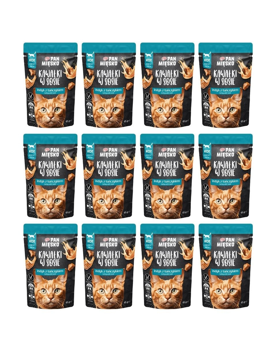 KOOSTIS: kalkun 71 % purustatud tükkides* (liha 27 %, südamed, maod, maks), tuunikala 8 % purustatud tükkides*, veiseliha 3 %, tapiokist tärklis, mineraalained, kuivatatud jõhvikad 0,2 %, lõheõli 0,2 %, kuivatatud õllepärm 0,2 %, basiilik 0,1 %. *Tükid moodustavad 52 % valmistoote massist.